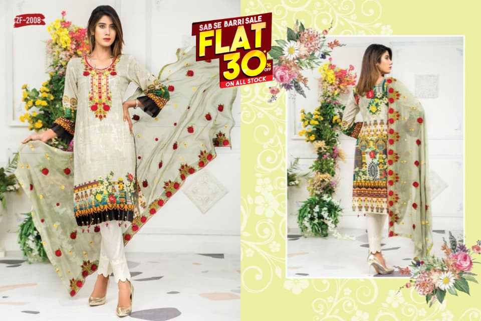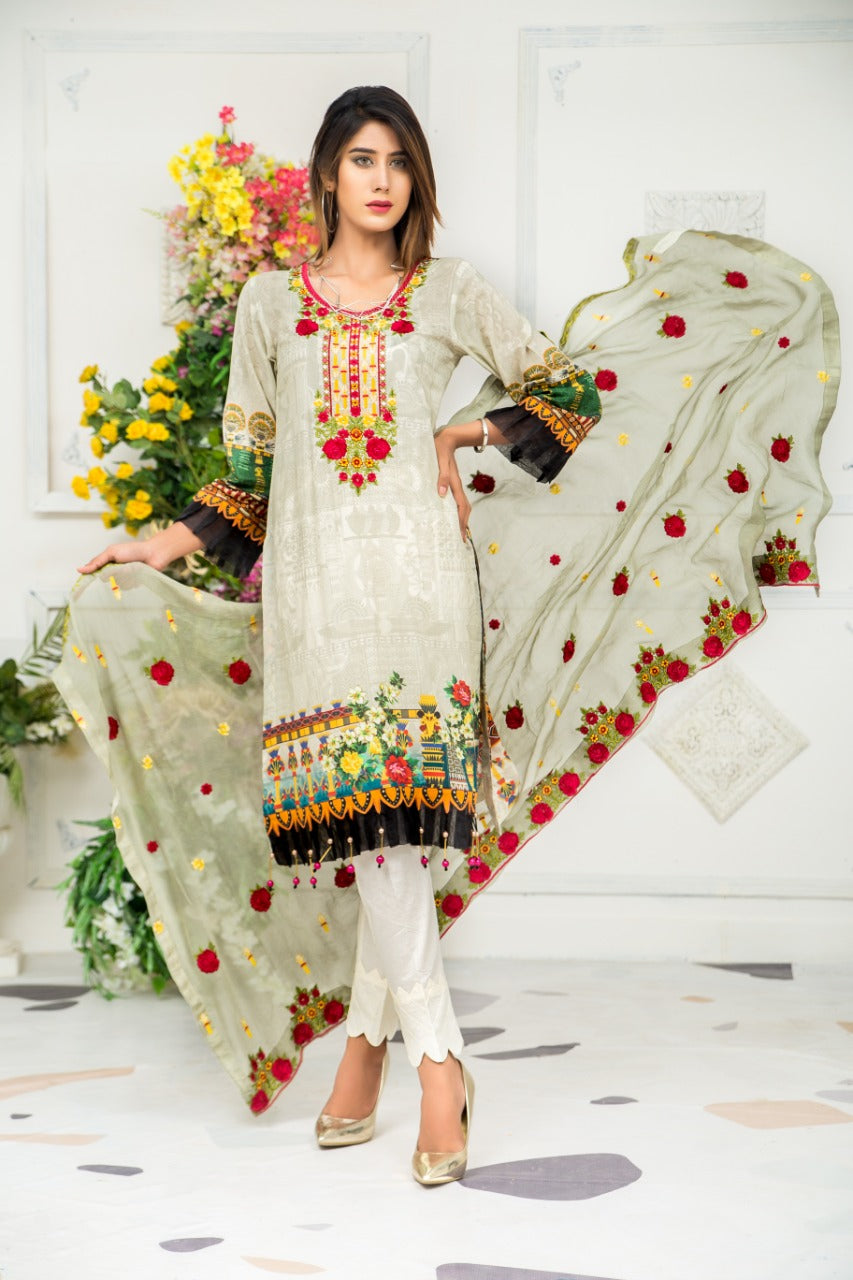 3 piece digital print and handwork embroidered lawn suit with digital print chiffon fabric for dupatta , dyed cotton fabric for trouser / shalwar.