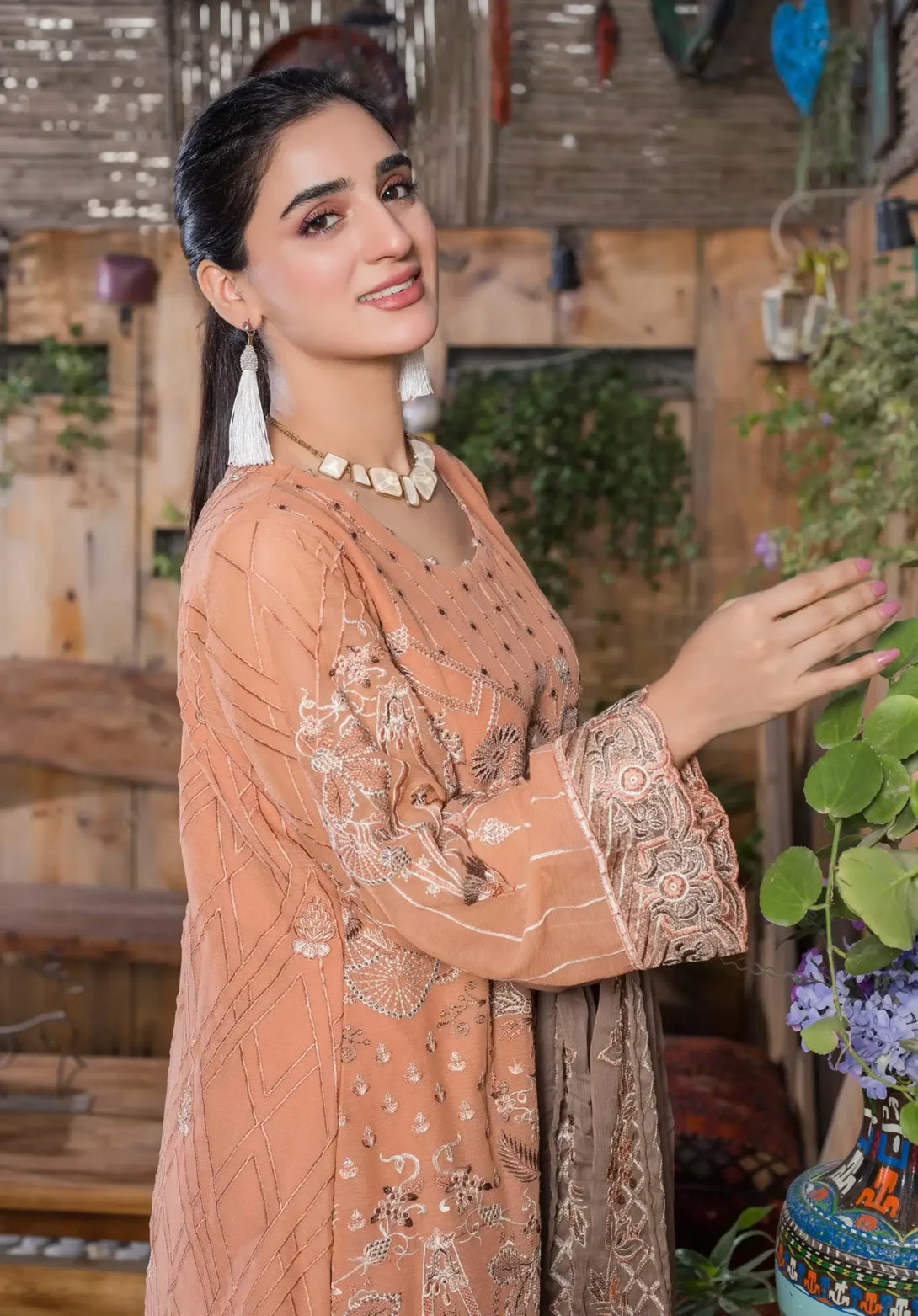 Chiffon Semi Stitch Shirt Pasted Embroidered Patches & A1 Embellishments Attached , As Show in Picture Ready to Wear Chiffon Embroidery Dupatta Unstitched Viscose Silk Trouser Fabric With Embroidered Patch.