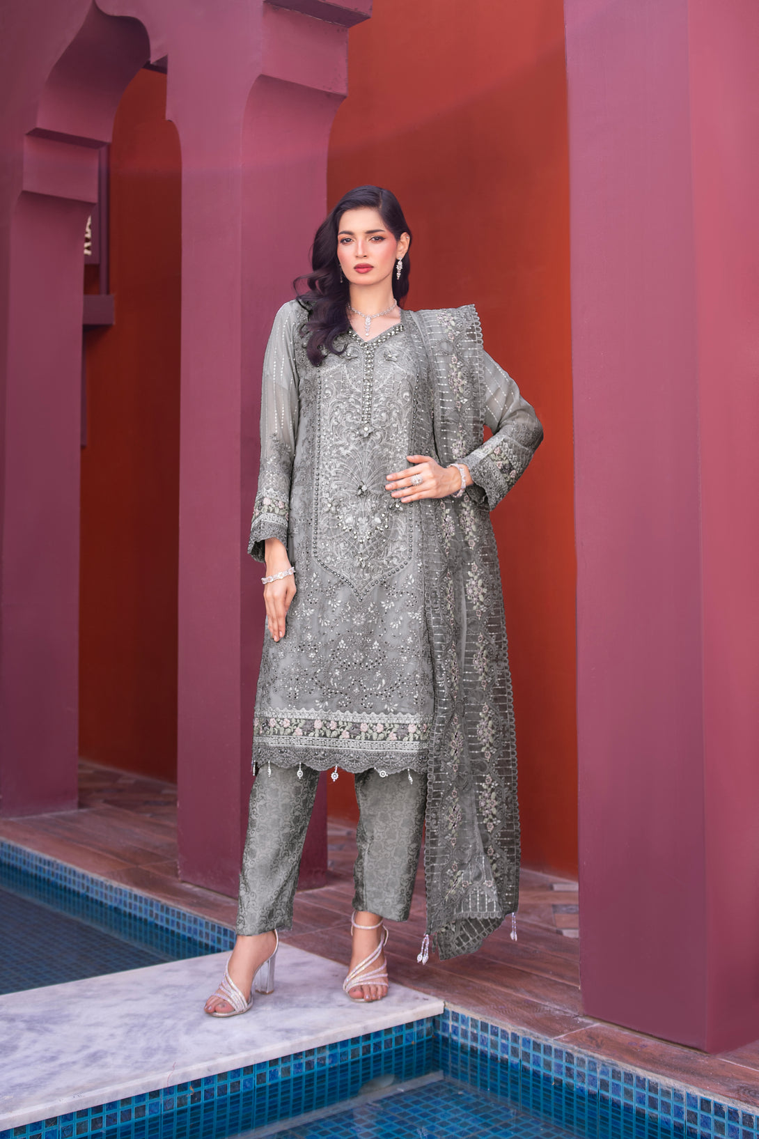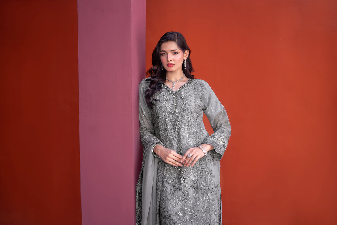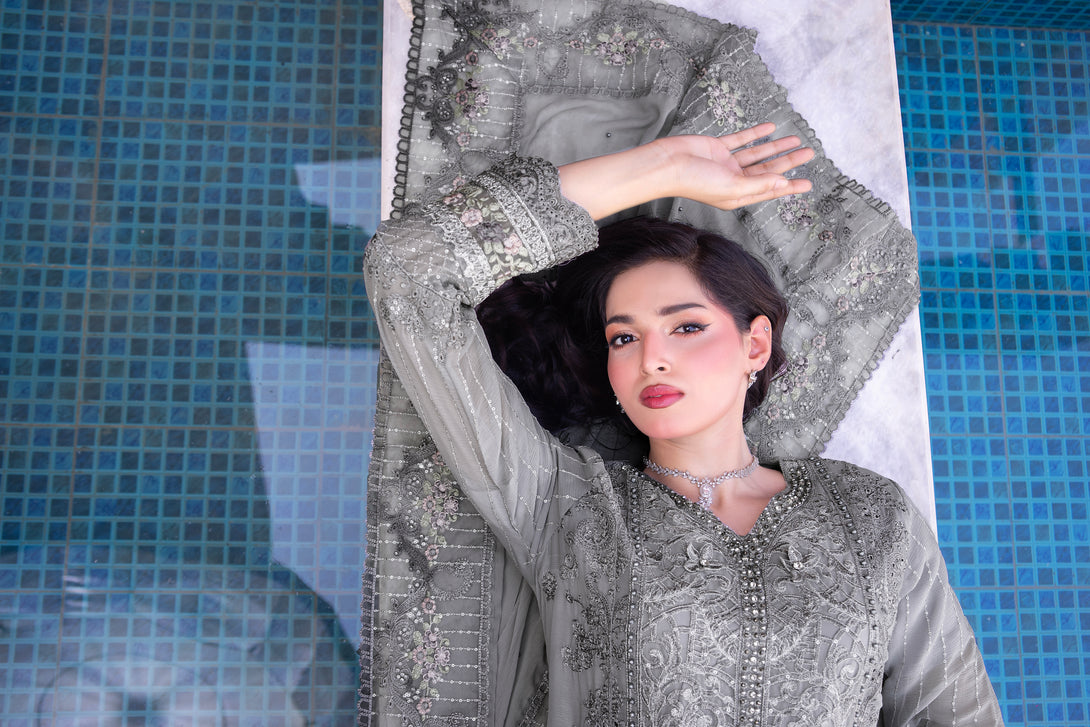 ZFRC-02 RIWAYAT LUXURY CHIFFON Elevate your wardrobe with this exquisite three-piece ensemble from Zainab Fazlani's Riwayat collection. The semi-stitched shirt features intricate heavy embroidery complemented by meticulous hand-crafted Adda work, showcasing traditional artistry. The coordinating chiffon organza dupatta arrives fully embellished with elaborate embroidery, adding sophistication to any occasion. Paired with a pure viscose jacquard trouser, this collection represents the pinnacle of luxury craftsmanship and refined elegance for the discerning wearer.