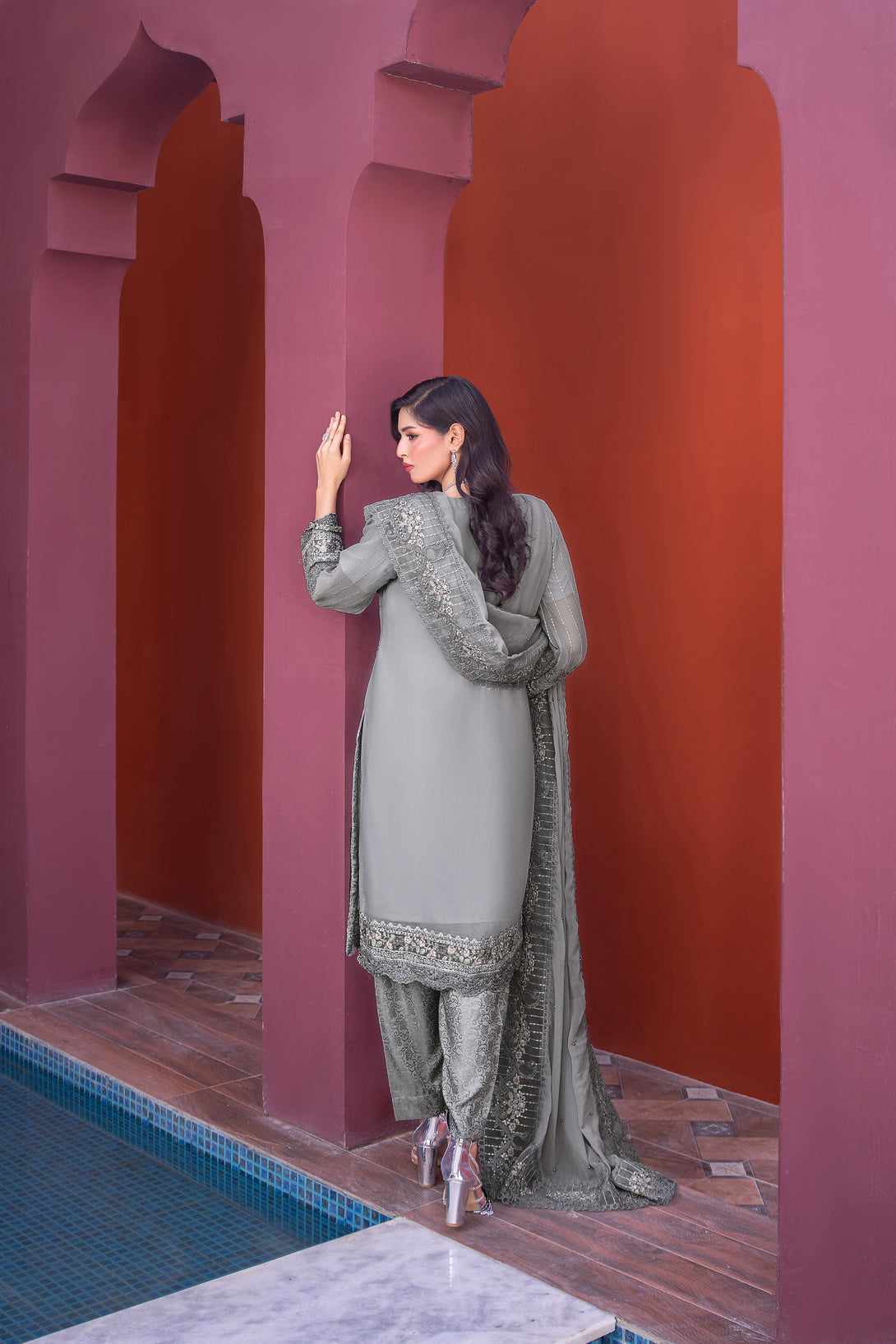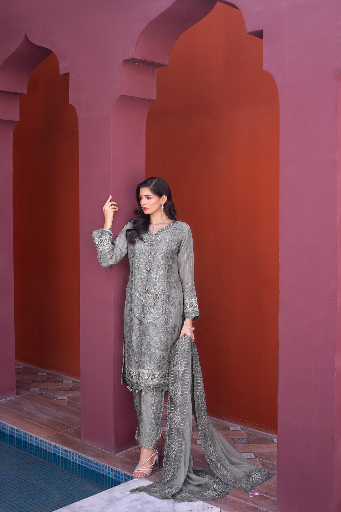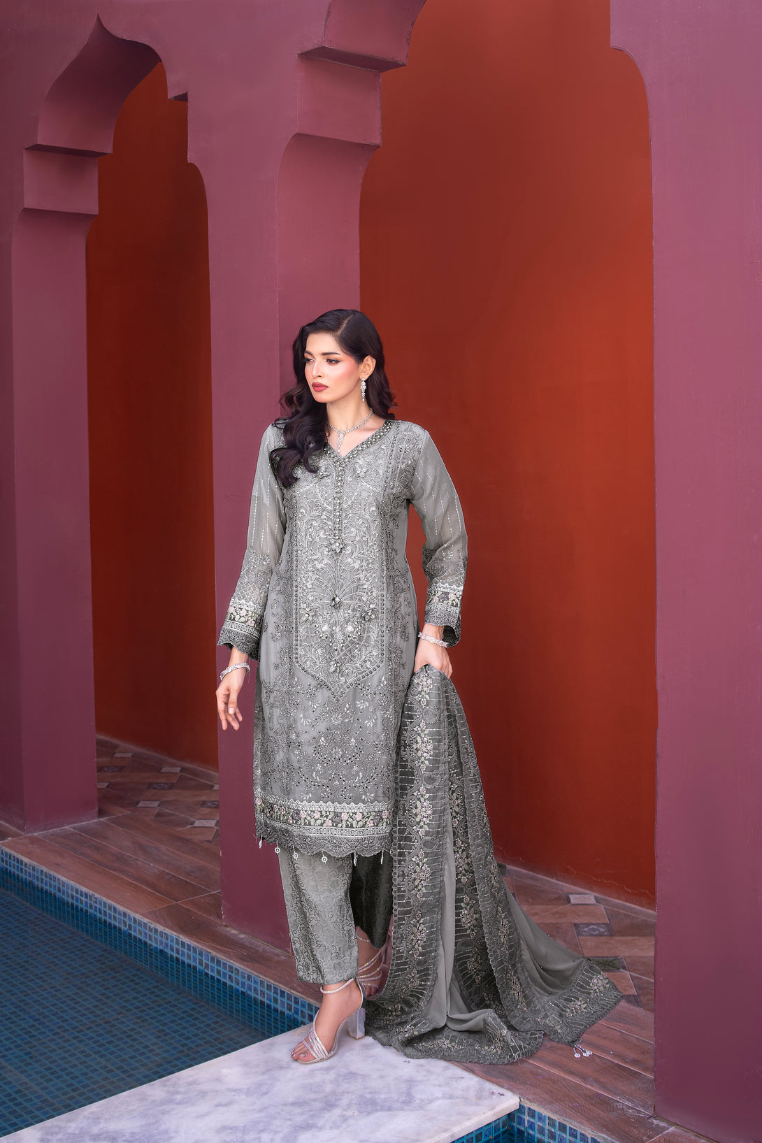 ZFRC-02 RIWAYAT LUXURY CHIFFON Elevate your wardrobe with this exquisite three-piece ensemble from Zainab Fazlani's Riwayat collection. The semi-stitched shirt features intricate heavy embroidery complemented by meticulous hand-crafted Adda work, showcasing traditional artistry. The coordinating chiffon organza dupatta arrives fully embellished with elaborate embroidery, adding sophistication to any occasion. Paired with a pure viscose jacquard trouser, this collection represents the pinnacle of luxury craftsmanship and refined elegance for the discerning wearer.