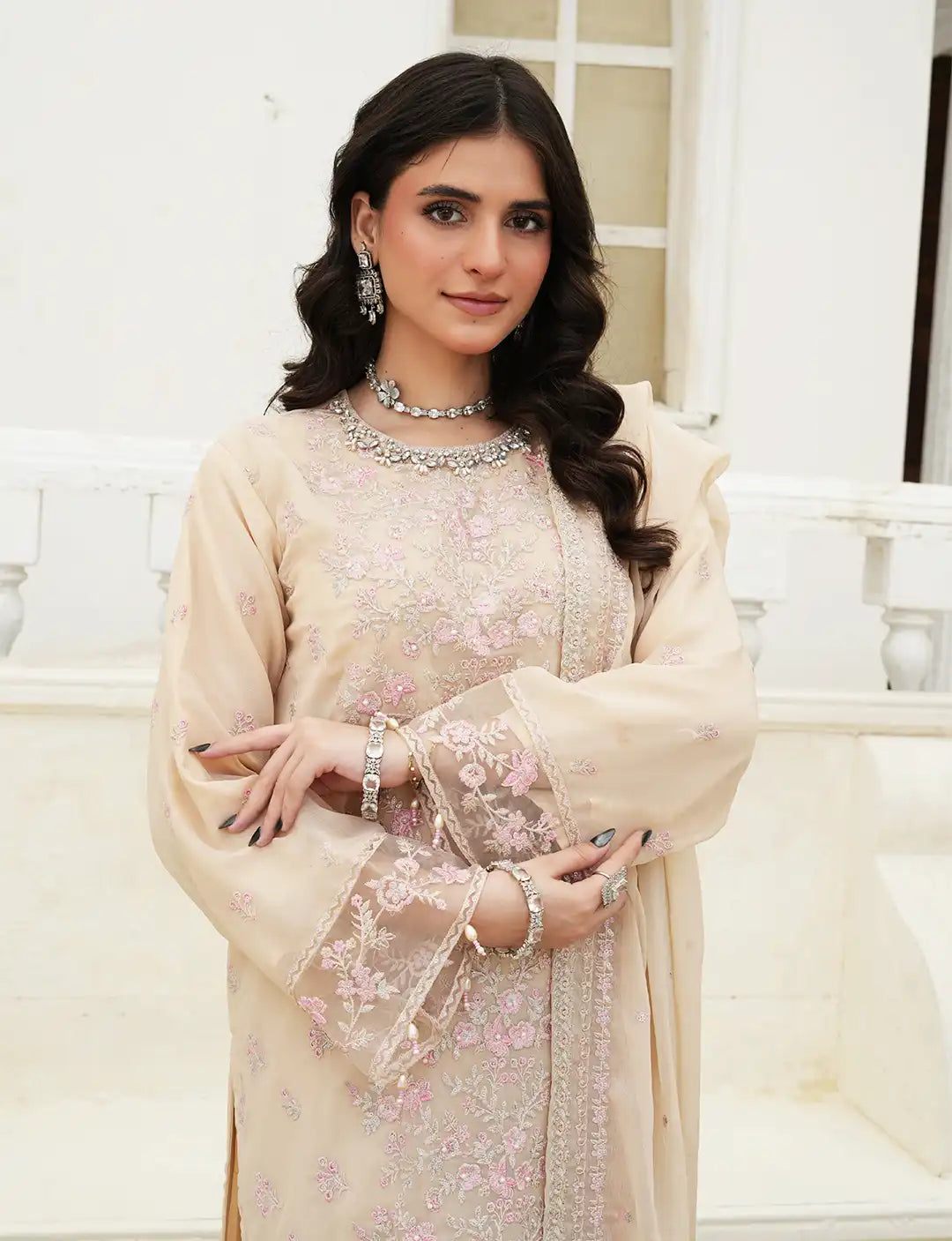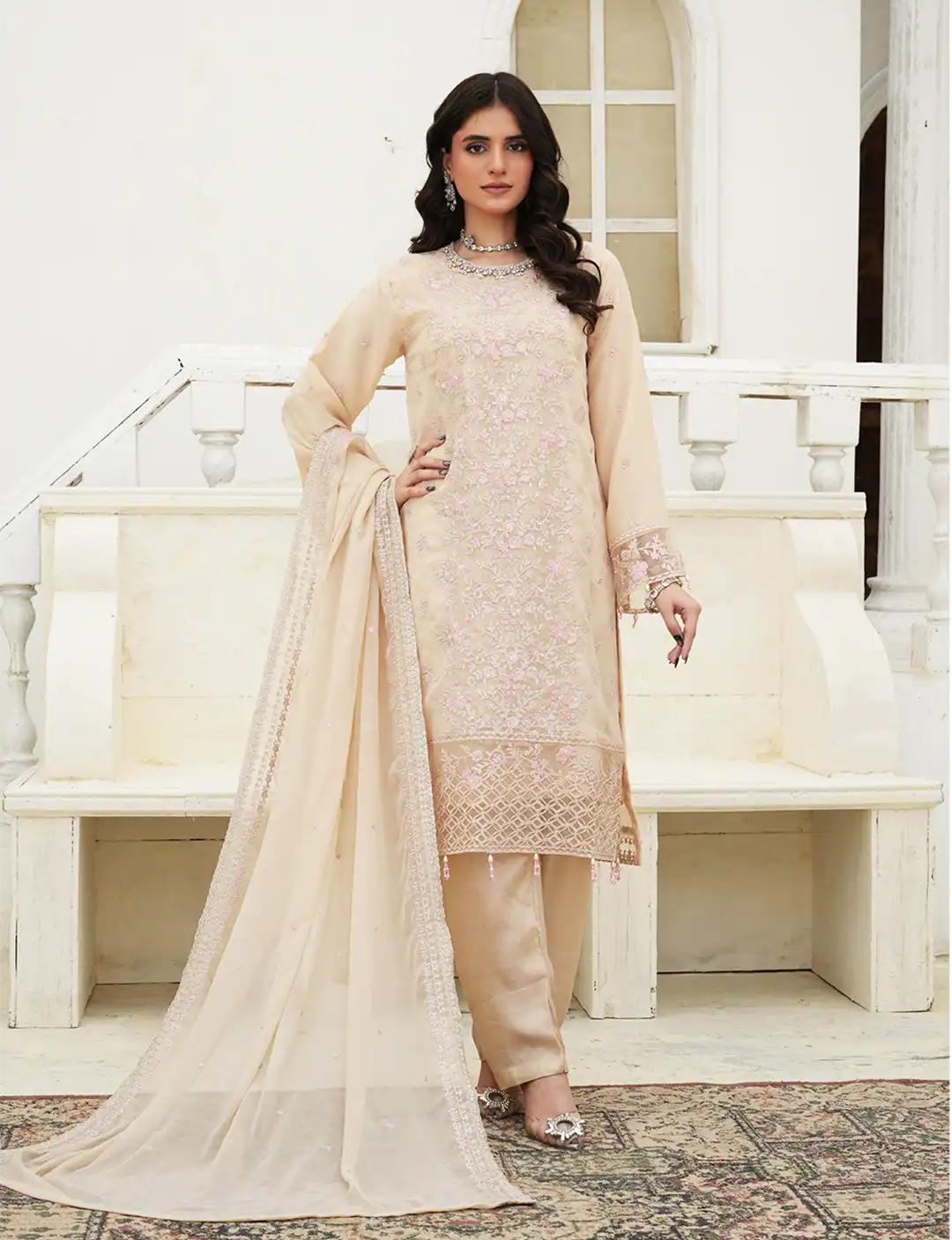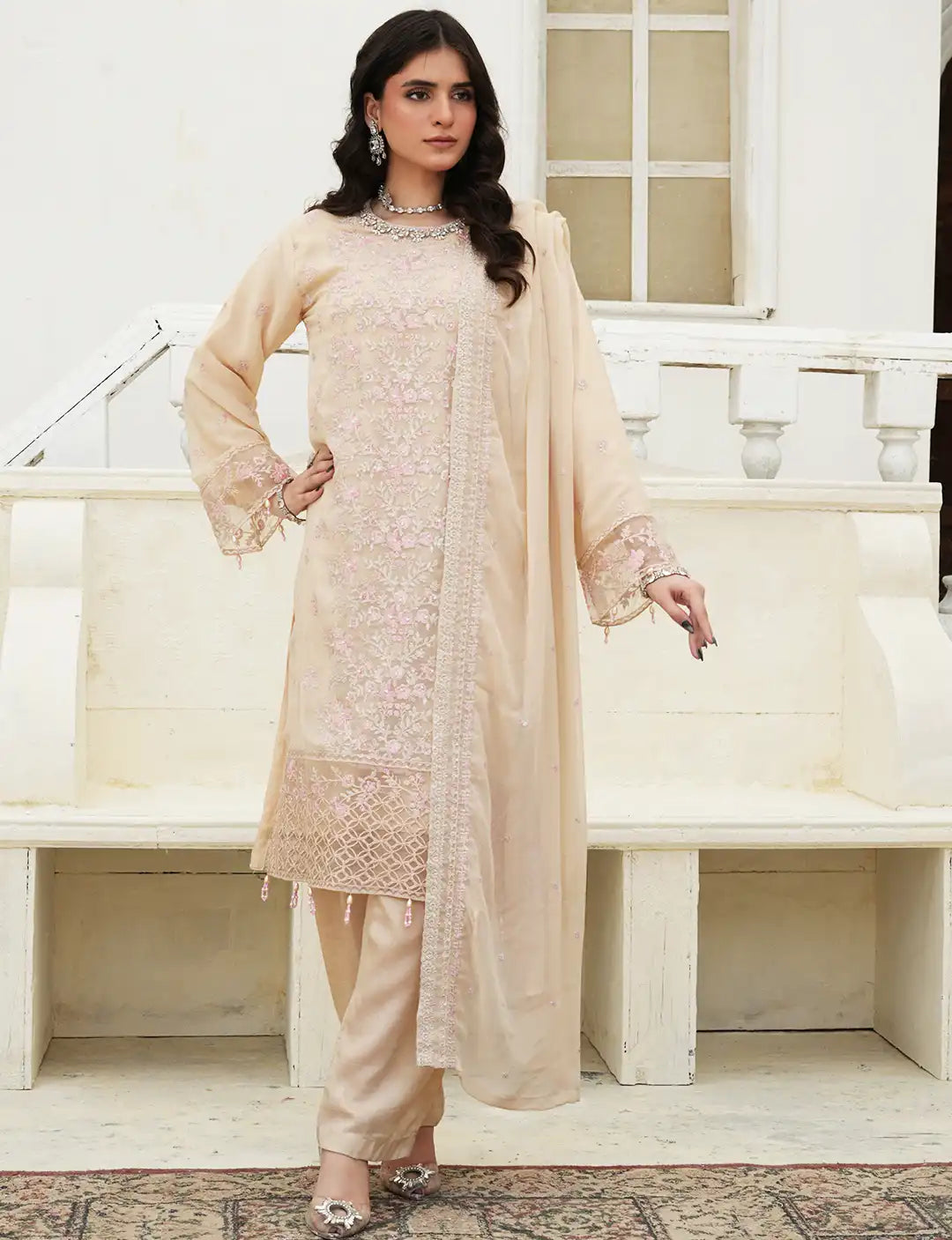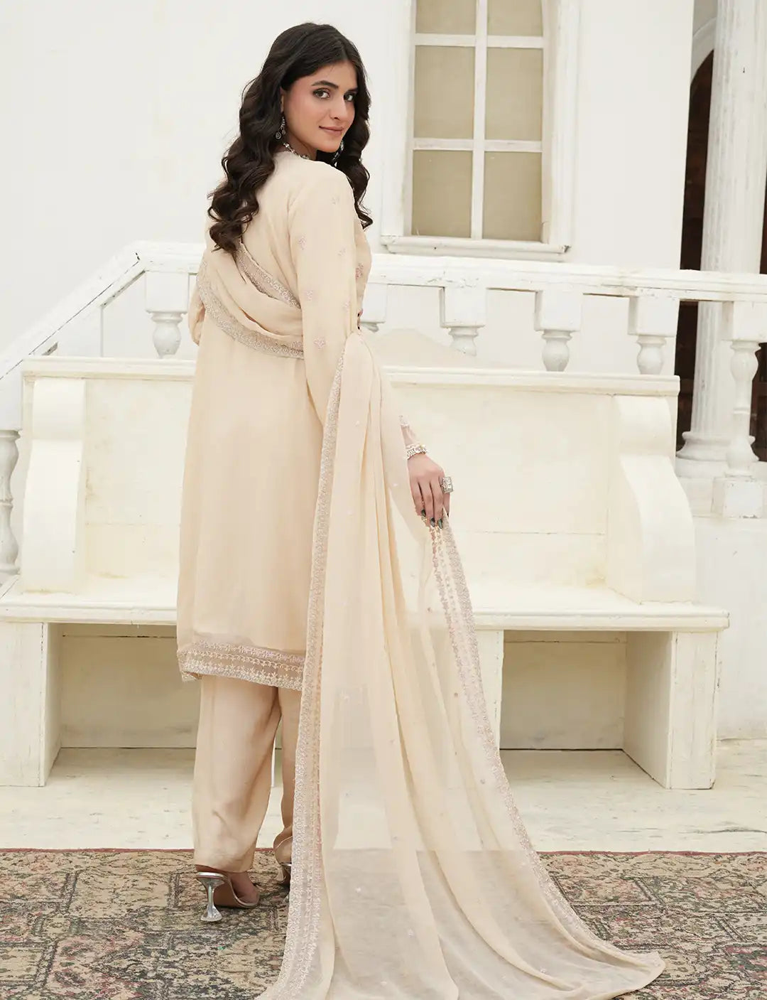 This Signature Chiffon 3-Piece Ready-to-Wear set by Zainab Fazlani features an exquisitely embroidered chiffon shirt with delicate handmade adda work. The matching chiffon dupatta is richly embellished, adding an elegant touch. Completing the ensemble, the trouser is crafted from pure raw silk for a refined finish. Available in four unique designs with a total of 12 suits per set, sizes include Small, Medium, and Large. Perfect for those seeking sophisticated craftsmanship and ready-to-wear convenience.