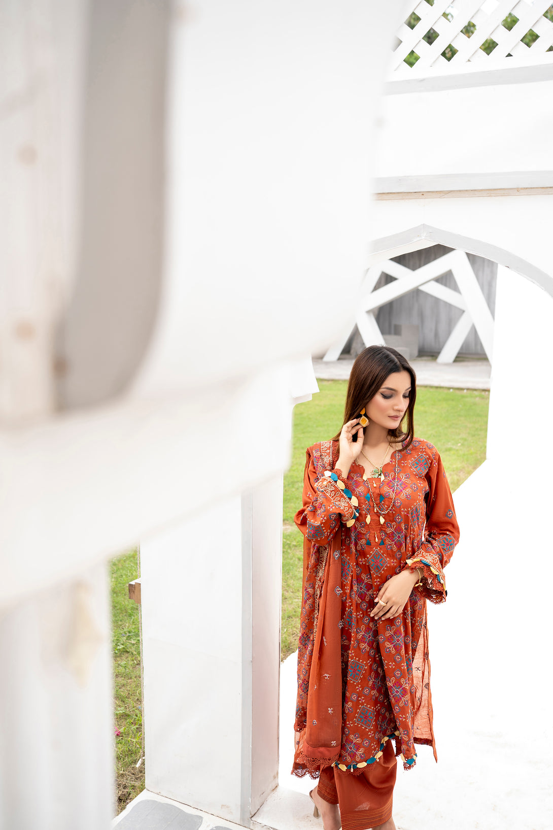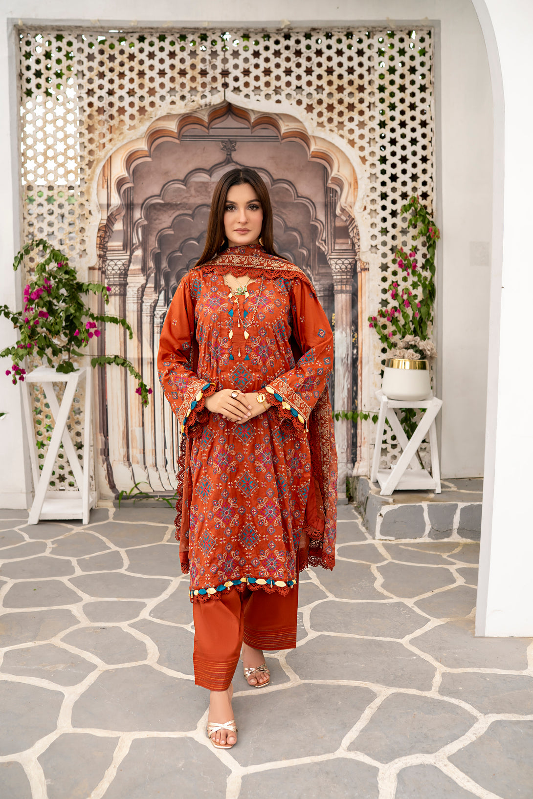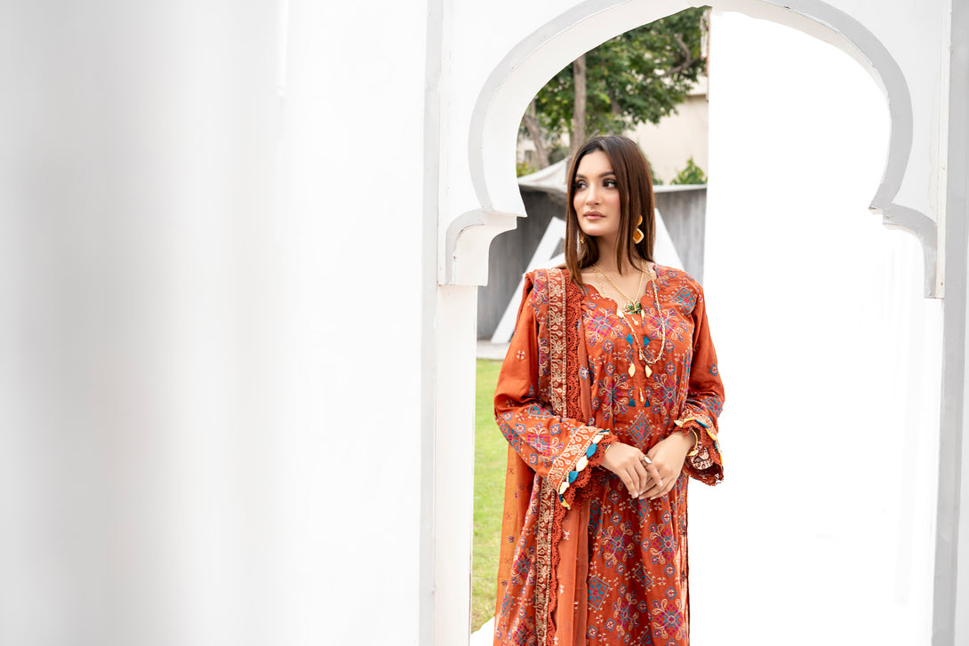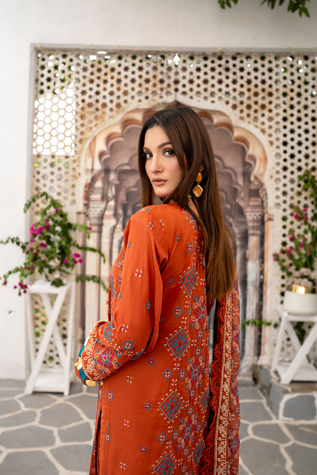Mehrunisa from the Kiran Cambric Collection showcases traditional craftsmanship with a modern touch in a captivating rust-orange shade. This elegant ensemble features finely embroidered lawn fabrics on the front, back, and sleeves, paired with an intricately embroidered chiffon dupatta measuring 2.5 meters. The dyed cotton trouser fabric adds comfort to the sophisticated design, making it ideal for festive occasions and intimate celebrations where cultural artistry shines.