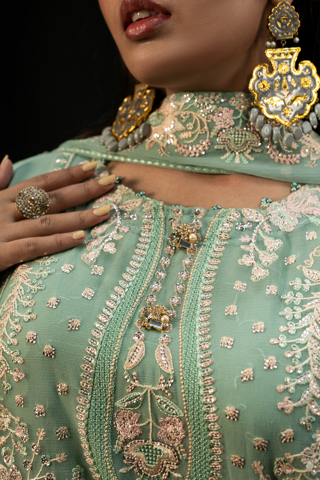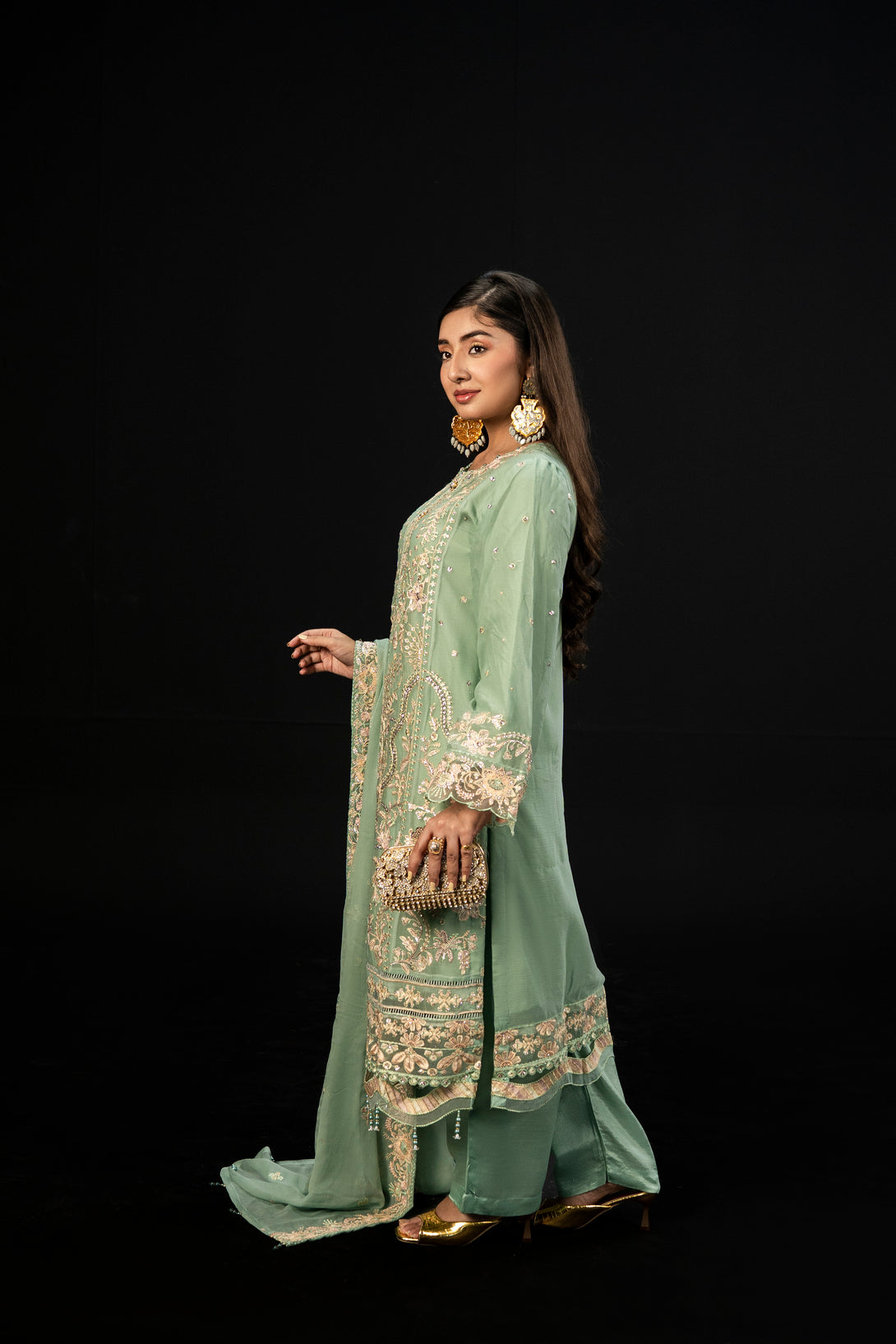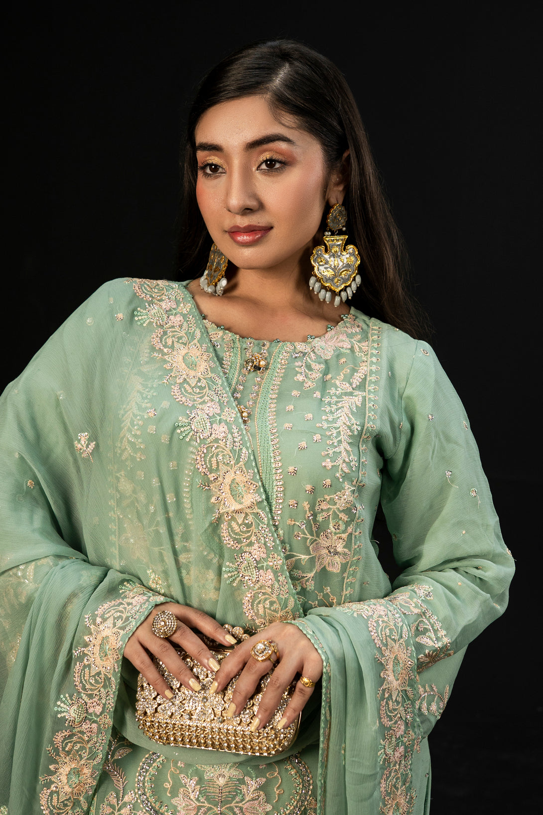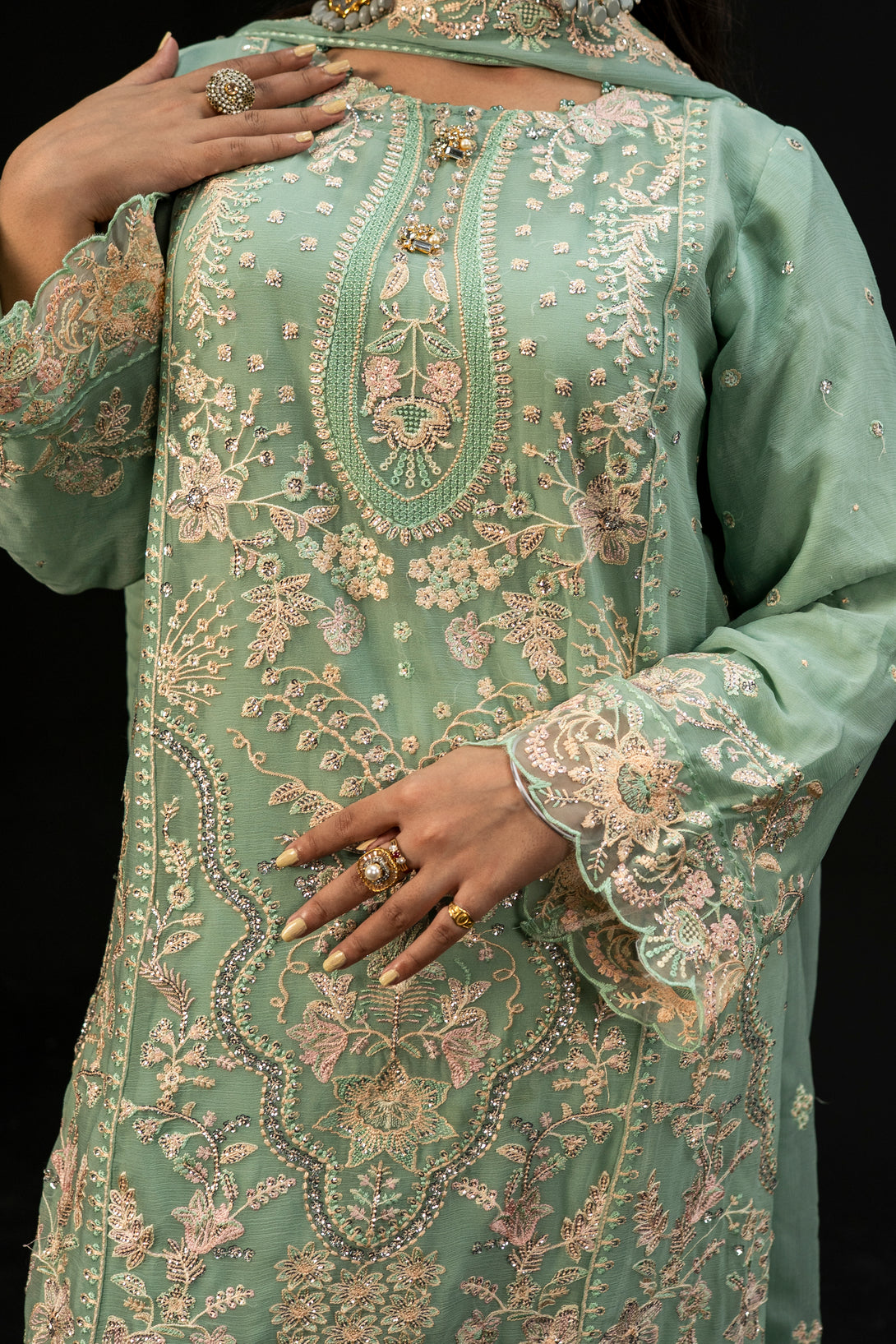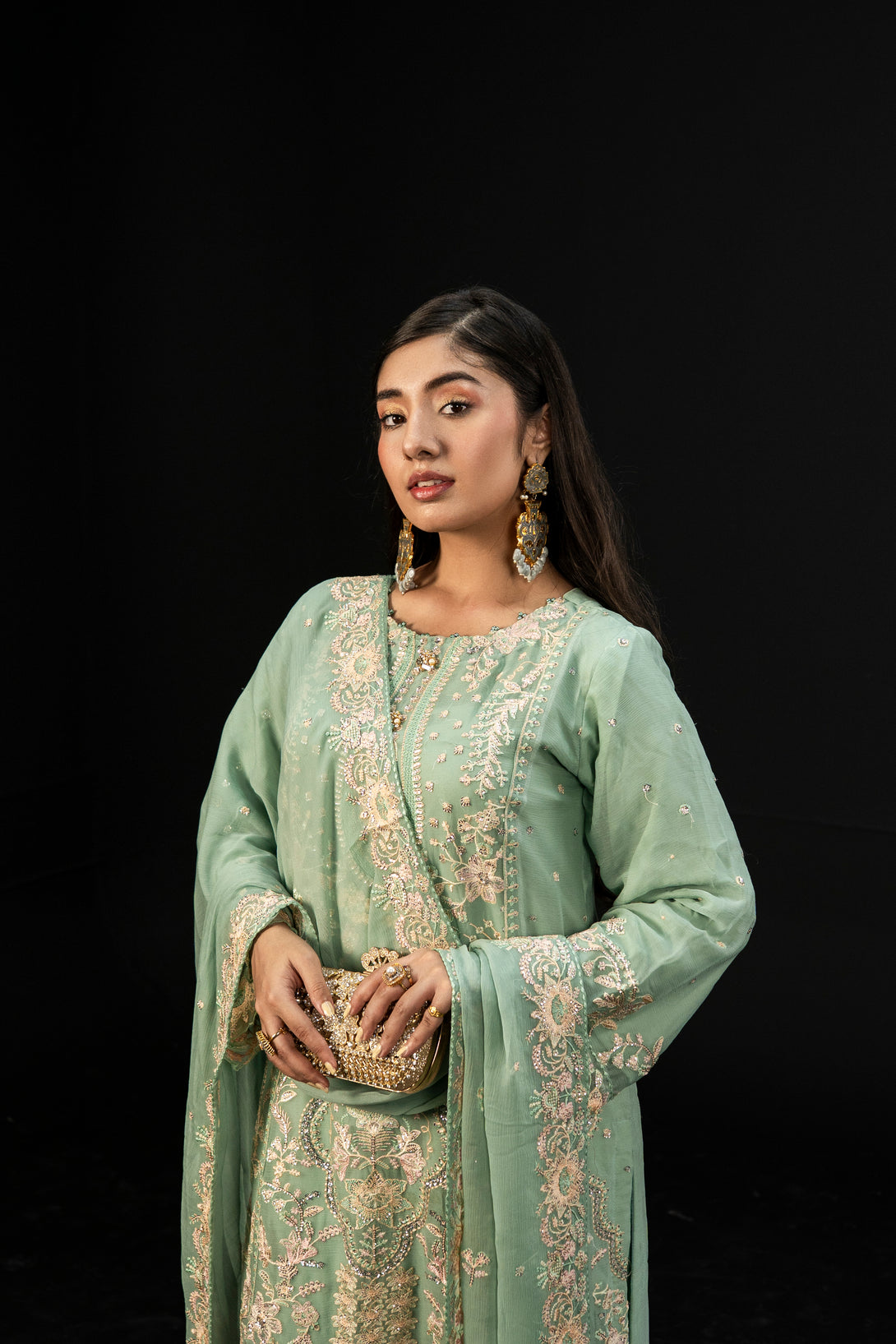Mint Éclat offers a refined blend of tradition and contemporary style in a calming pistachio green. This semi-stitched formal set features a crinkle chiffon shirt embellished with delicate threadwork and sequins, enhanced by expert adda takai hand embroidery. A matching chiffon dupatta with detailed embellishments adds a sophisticated finishing touch. Included viscose staple fabric pants provide comfortable elegance, completing an ensemble ideal for festive events and special occasions.