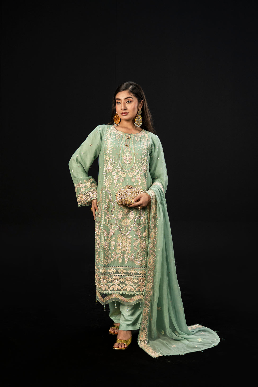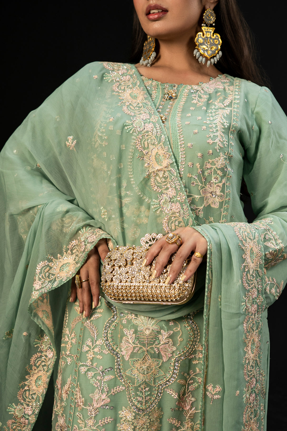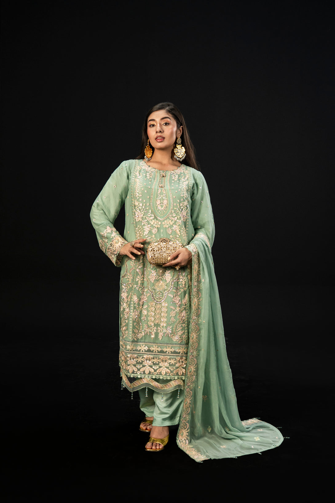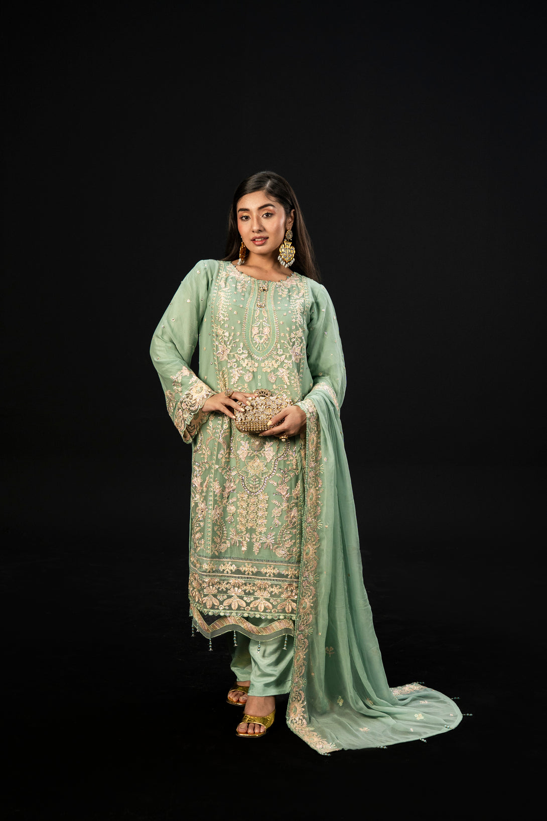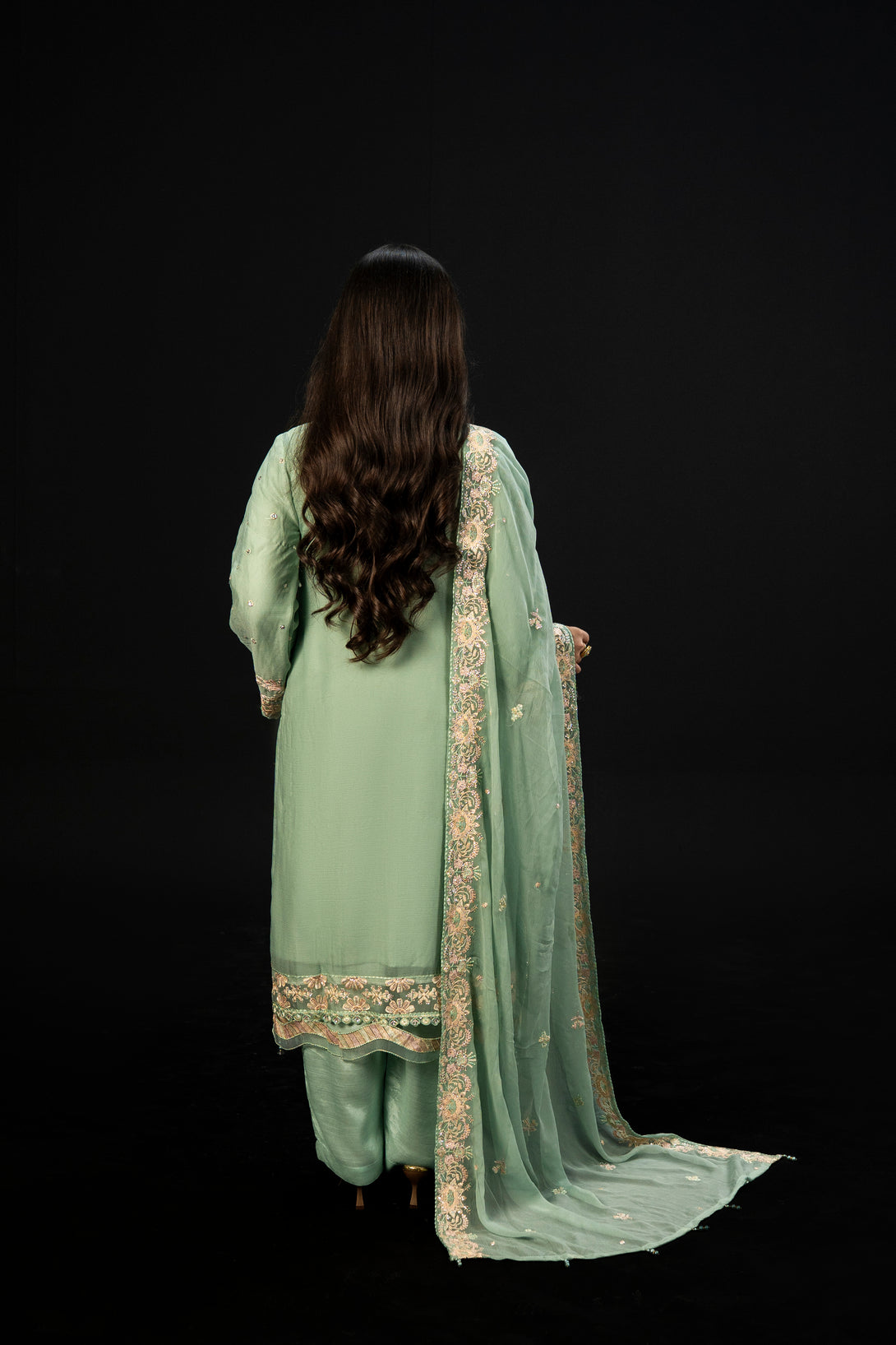 Mint Éclat offers a refined blend of tradition and contemporary style in a calming pistachio green. This semi-stitched formal set features a crinkle chiffon shirt embellished with delicate threadwork and sequins, enhanced by expert adda takai hand embroidery. A matching chiffon dupatta with detailed embellishments adds a sophisticated finishing touch. Included viscose staple fabric pants provide comfortable elegance, completing an ensemble ideal for festive events and special occasions.