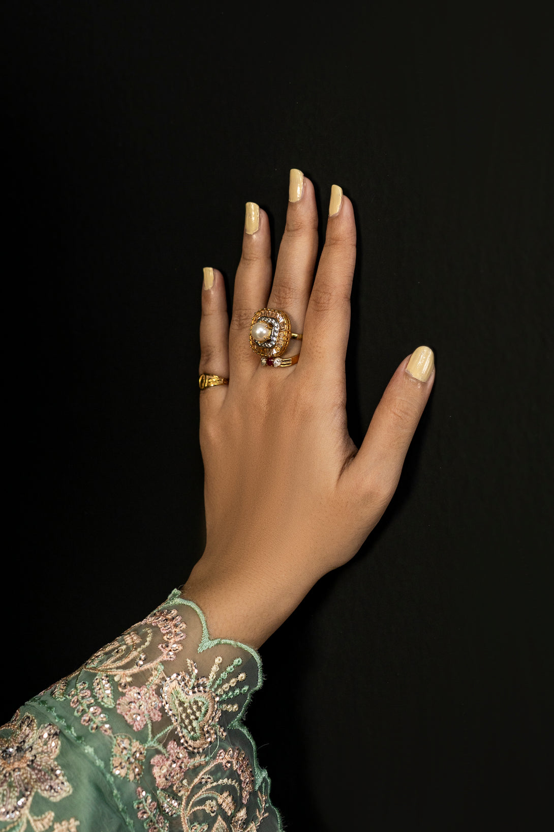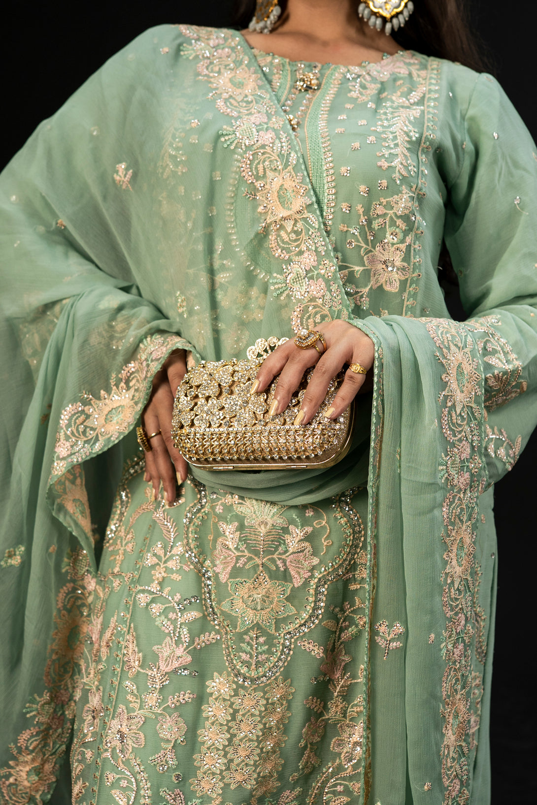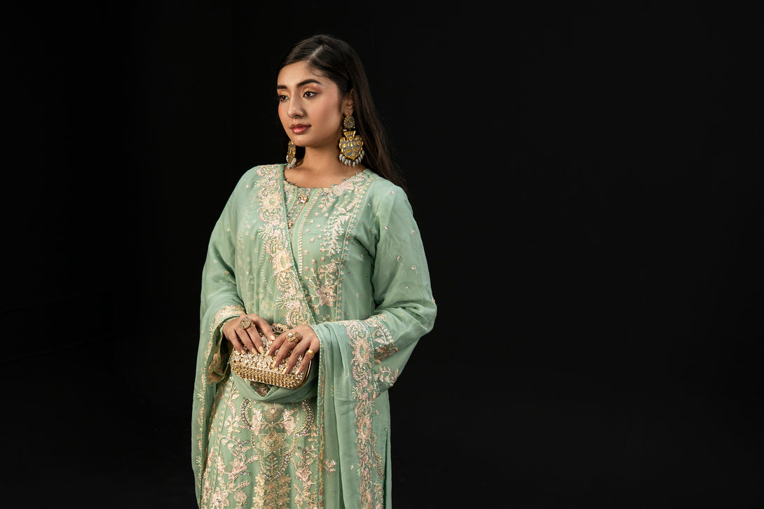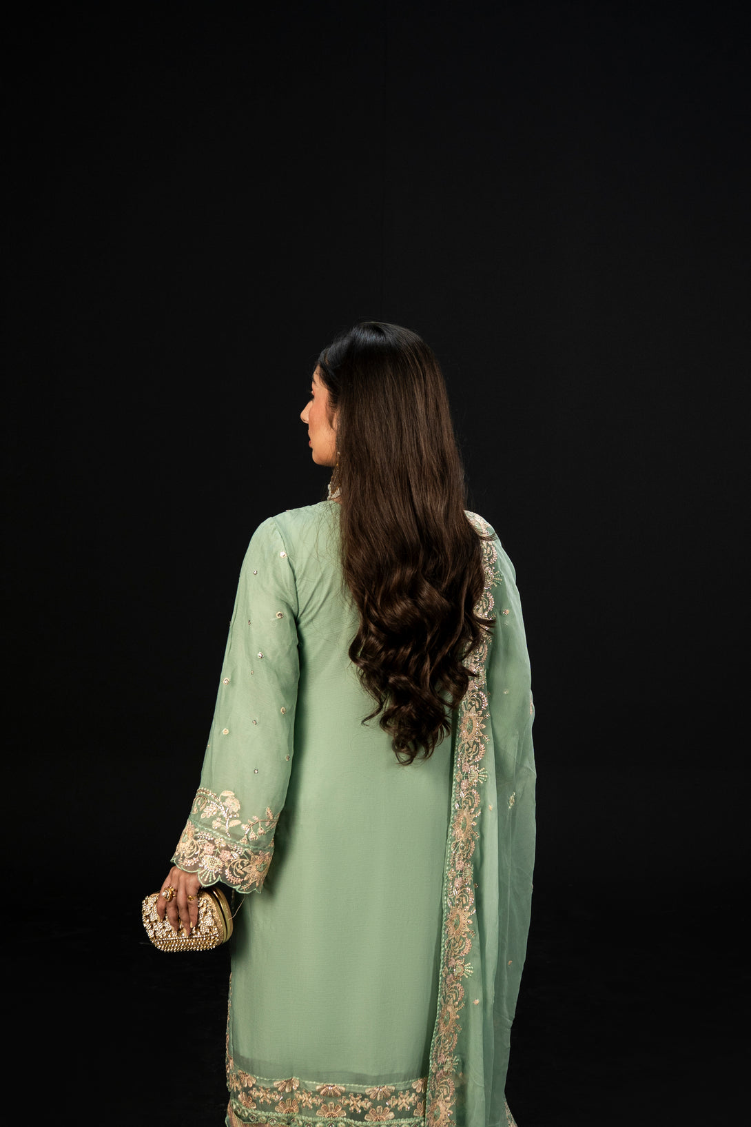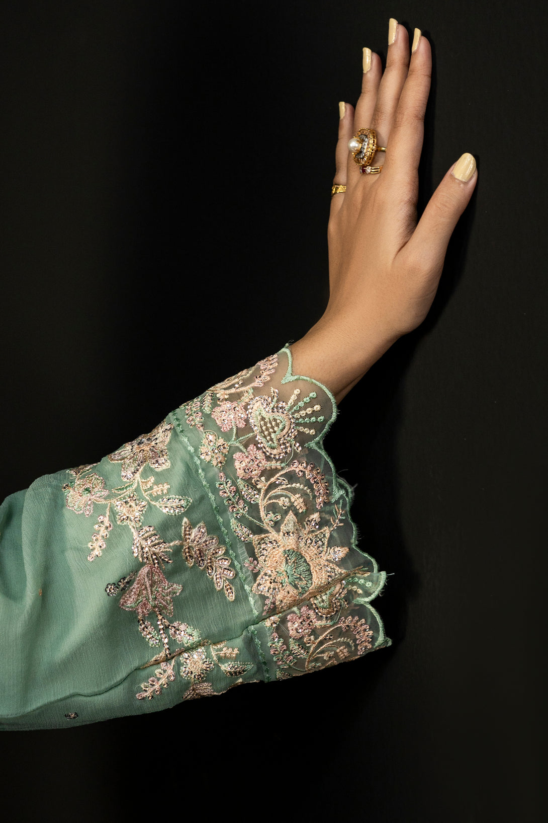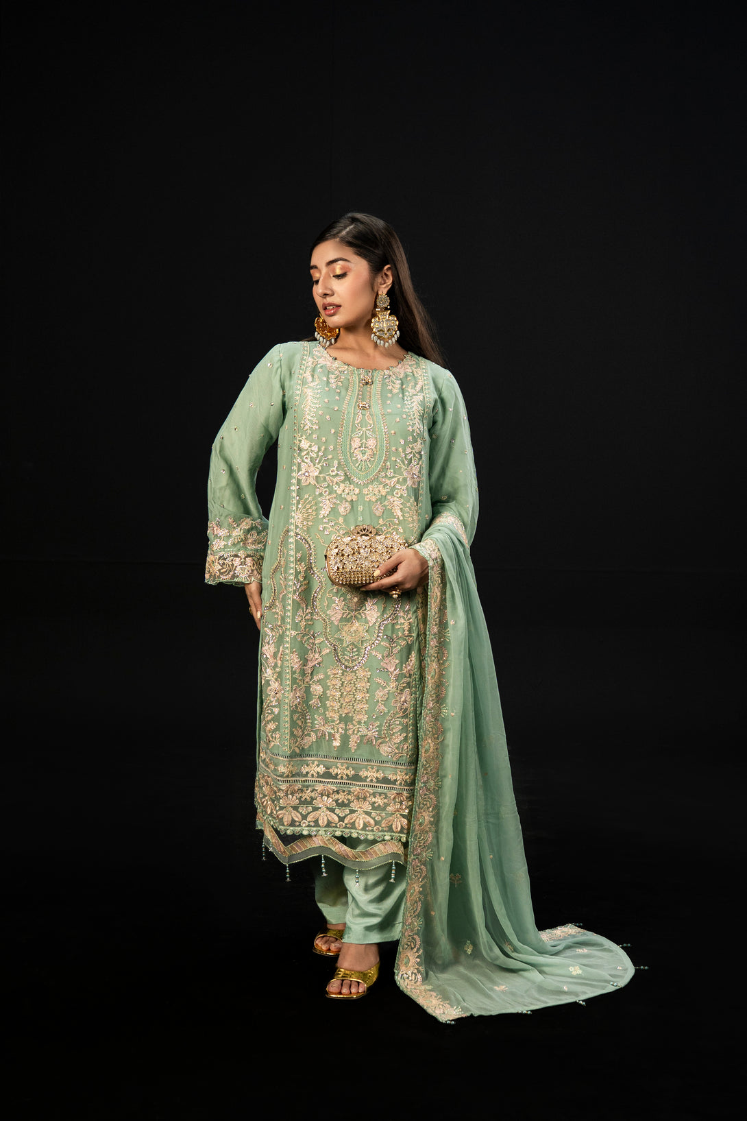 Mint Éclat offers a refined blend of tradition and contemporary style in a calming pistachio green. This semi-stitched formal set features a crinkle chiffon shirt embellished with delicate threadwork and sequins, enhanced by expert adda takai hand embroidery. A matching chiffon dupatta with detailed embellishments adds a sophisticated finishing touch. Included viscose staple fabric pants provide comfortable elegance, completing an ensemble ideal for festive events and special occasions.