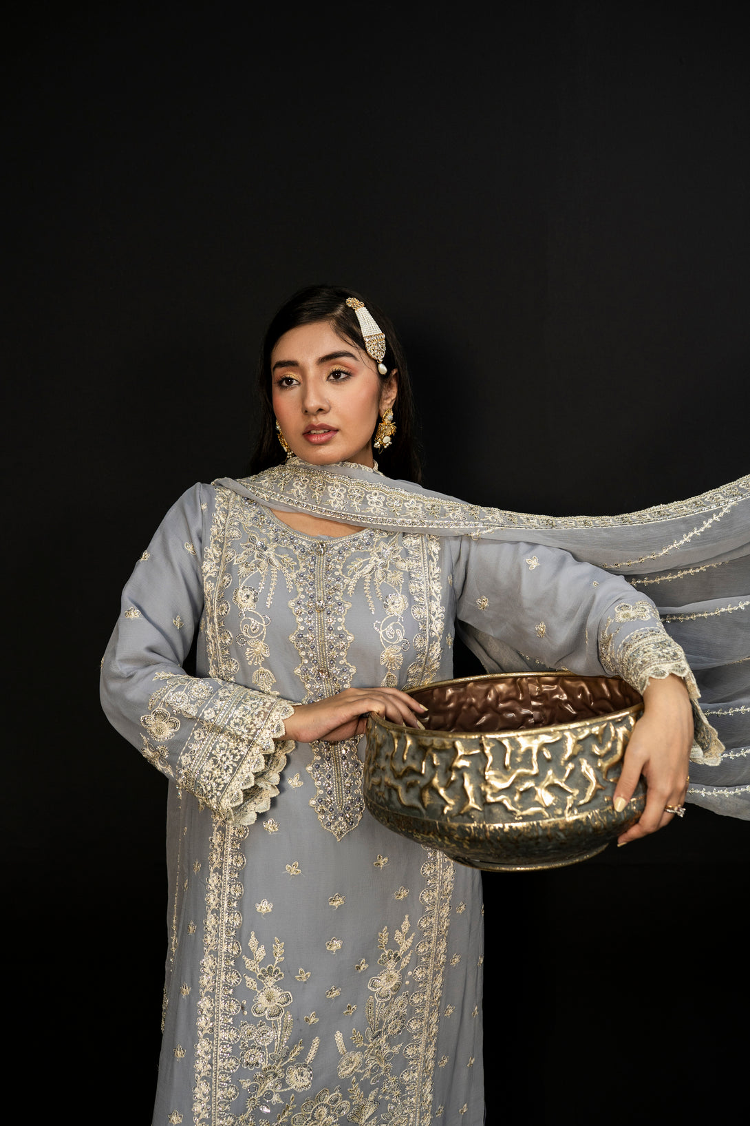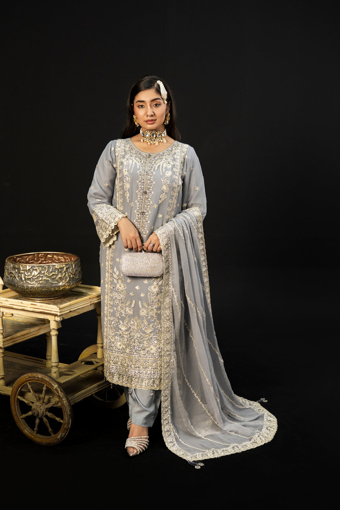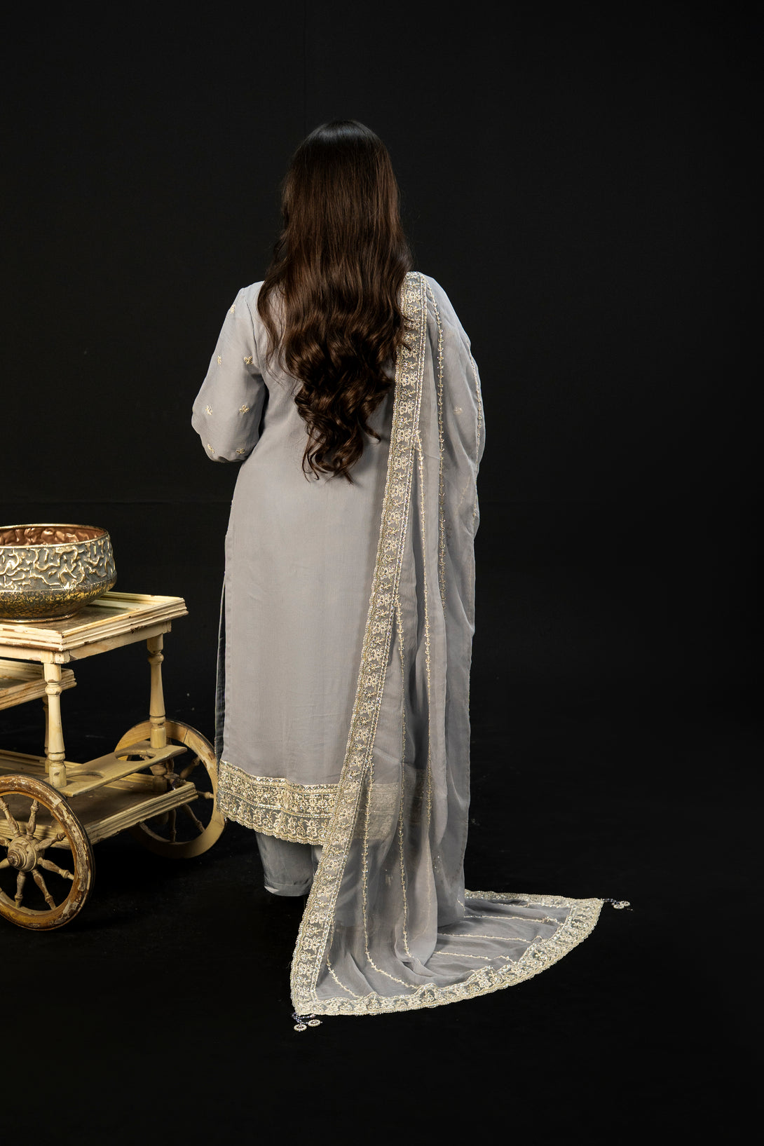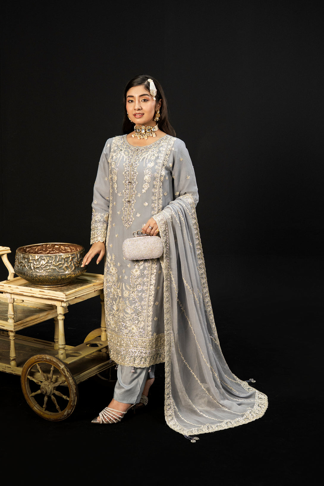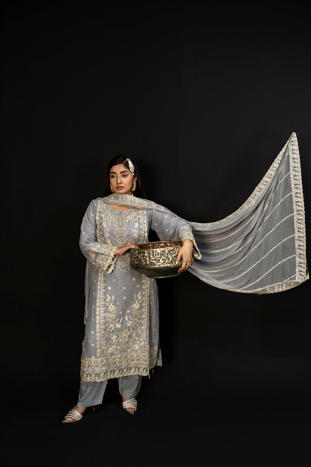 Moonlit Grace embodies the quiet elegance of a moonlit night with its dove-grey crinkle chiffon fabric. The semi-stitched formal shirt features intricate hand embroidery and adda takaai embellishments, exuding refined craftsmanship. Complemented by a beautifully detailed dupatta with ornate borders and delicate adornments, this ensemble offers a graceful silhouette. Paired with comfortable viscose staple fabric trousers, Moonlit Grace is an exquisite choice for formal events and festive occasions where understated sophistication is essential.