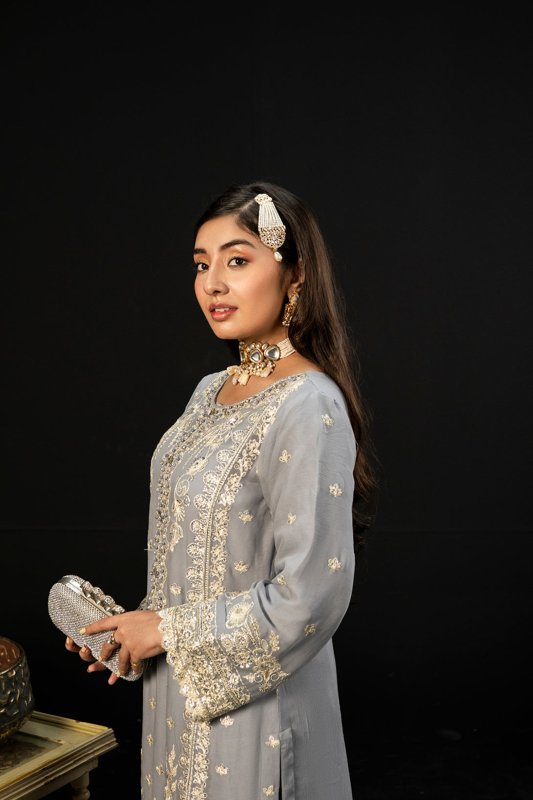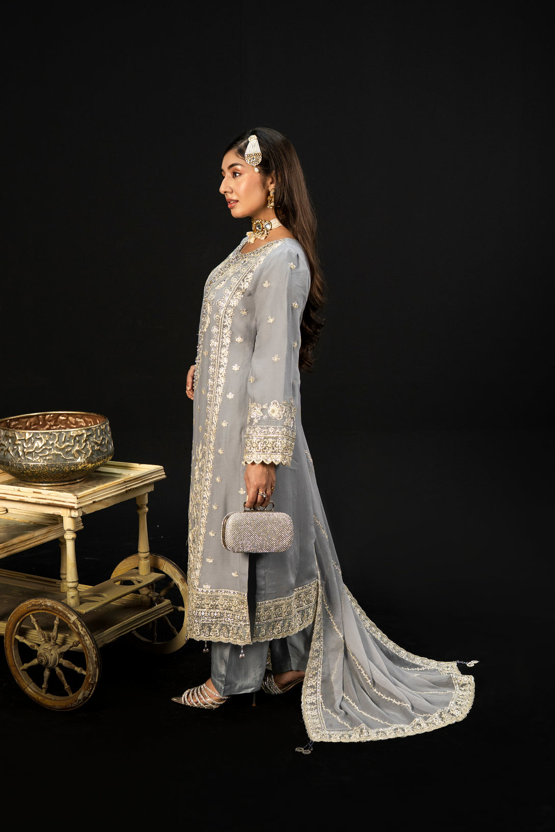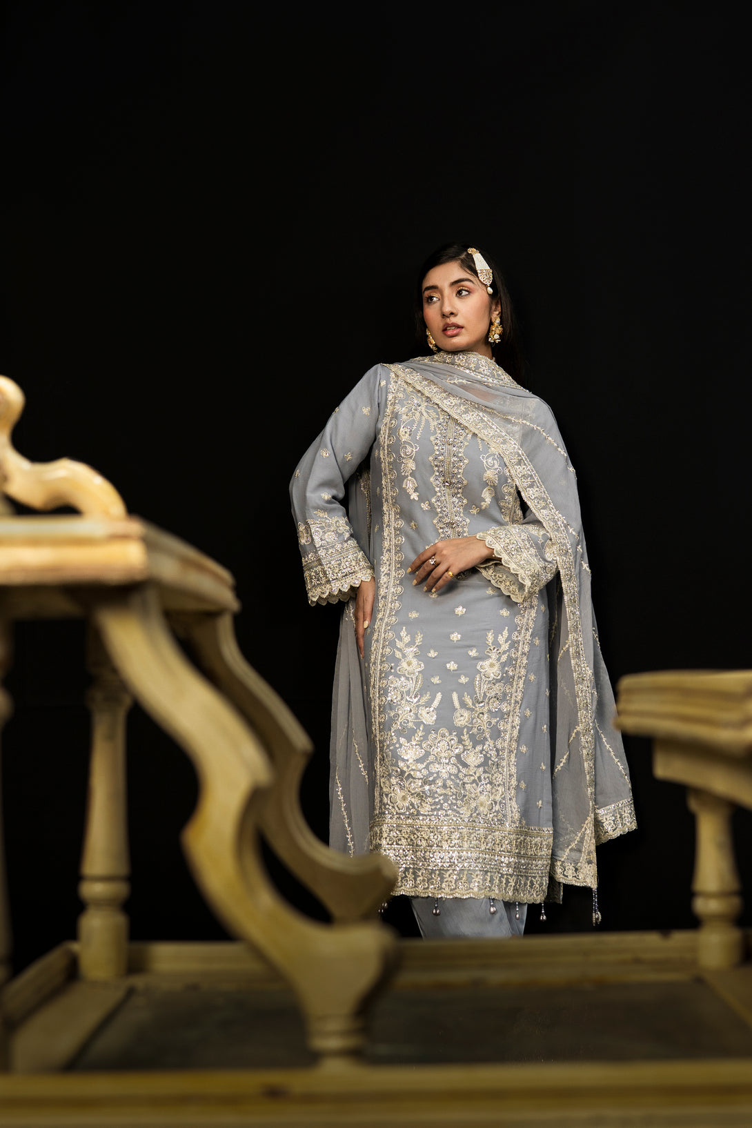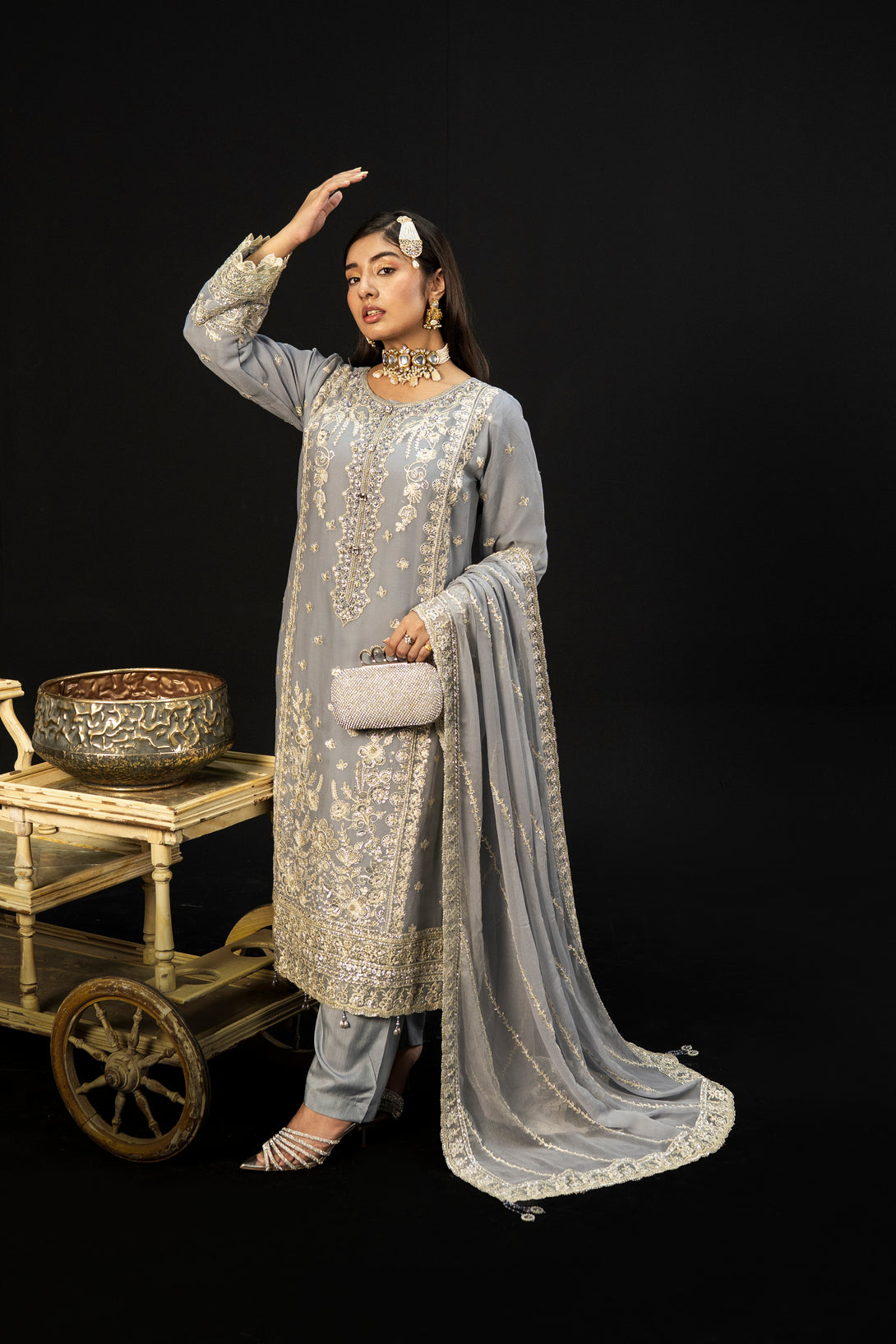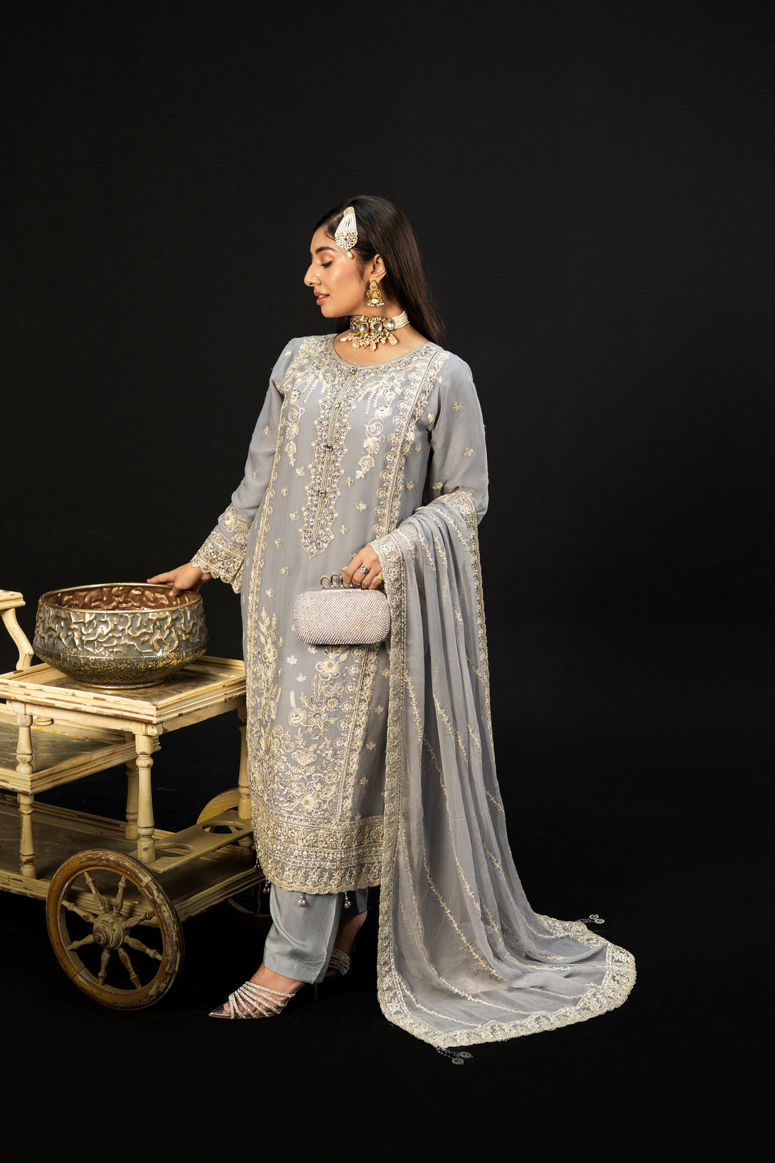 Moonlit Grace embodies the quiet elegance of a moonlit night with its dove-grey crinkle chiffon fabric. The semi-stitched formal shirt features intricate hand embroidery and adda takaai embellishments, exuding refined craftsmanship. Complemented by a beautifully detailed dupatta with ornate borders and delicate adornments, this ensemble offers a graceful silhouette. Paired with comfortable viscose staple fabric trousers, Moonlit Grace is an exquisite choice for formal events and festive occasions where understated sophistication is essential.