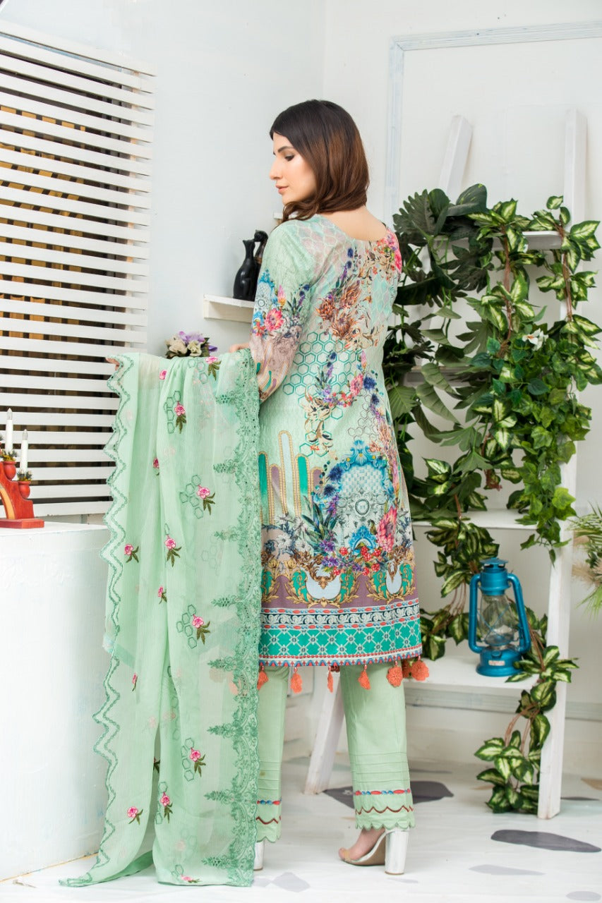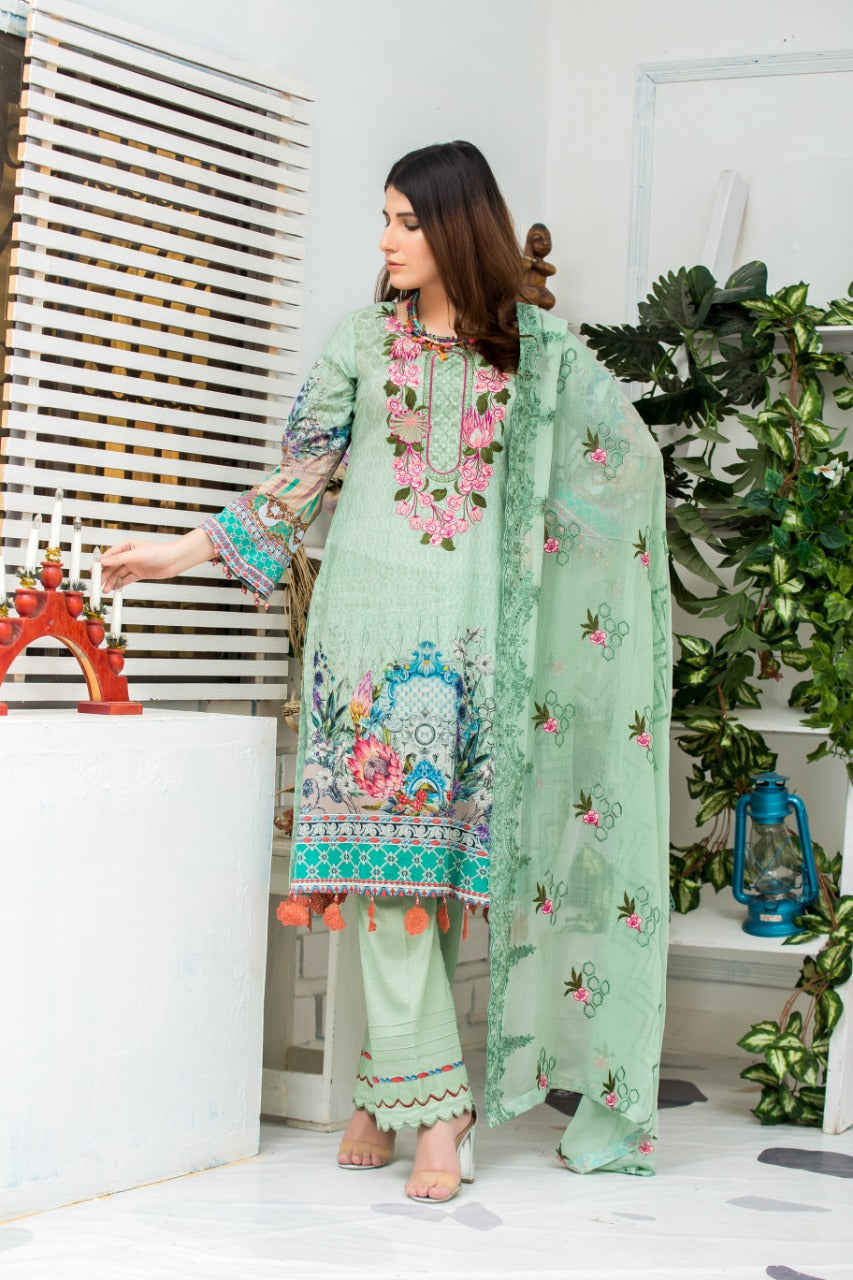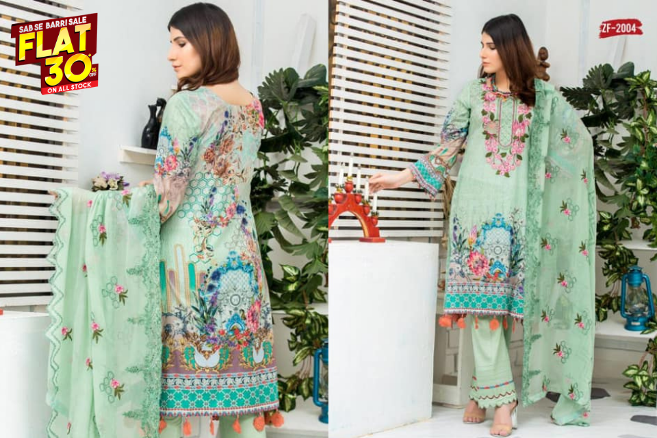 Zainab fazlani product description Details: 3 piece digital print and handwork embroidered lawn suit with digital print chiffon fabric for dupatta , dyed cotton fabric for trouser / shalwar. Note: Noor-e-chasham Digital Print Vol 1 By ZAINAB FAZLANI have been styled in the image for photography and illustrative purposes. The standard style comes as a long sleeved kameez with dupatta and trouser/shalwar. Note: Actual Product Colour Might Slightly Vary From The Image.