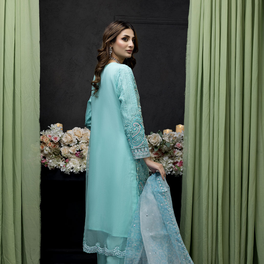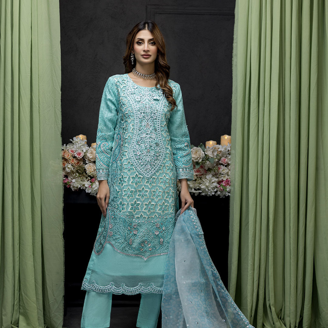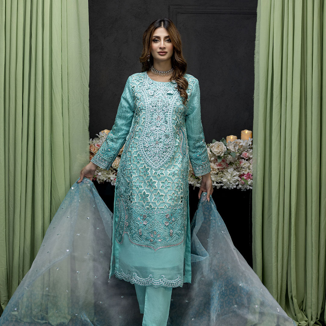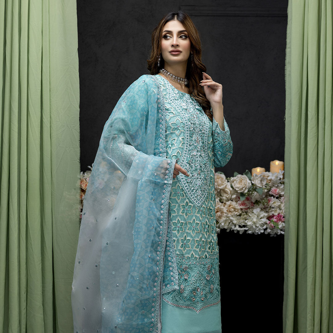 Shirt organza semi stitich embroidered shirtpure viscose inner attached and hand made adda work all embellishments attached