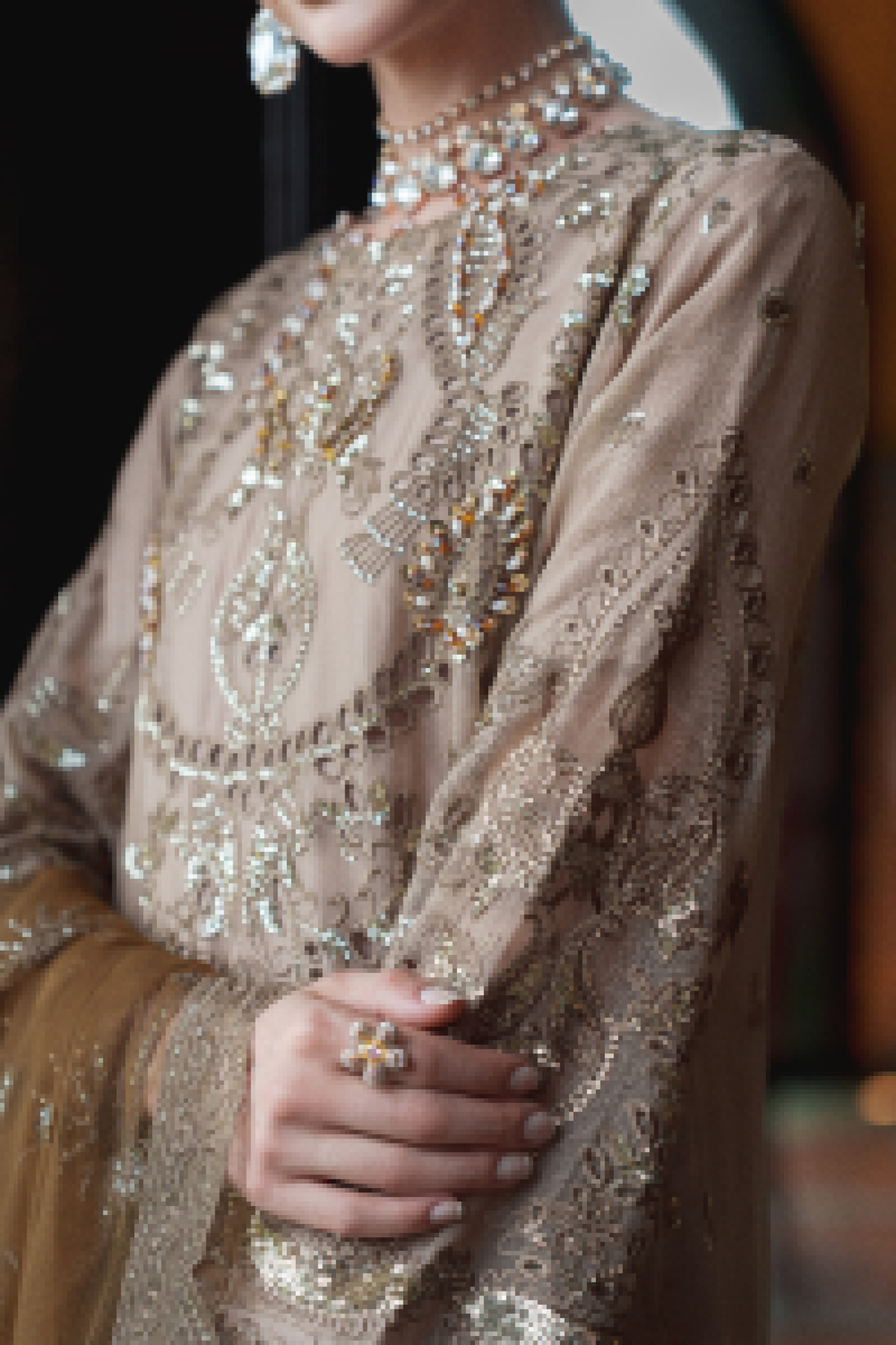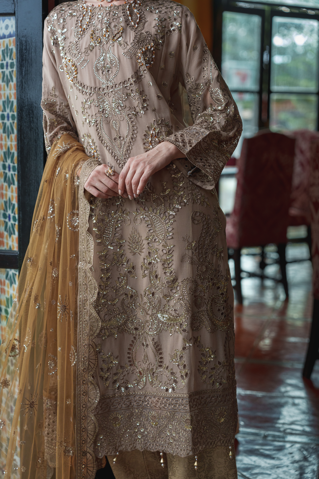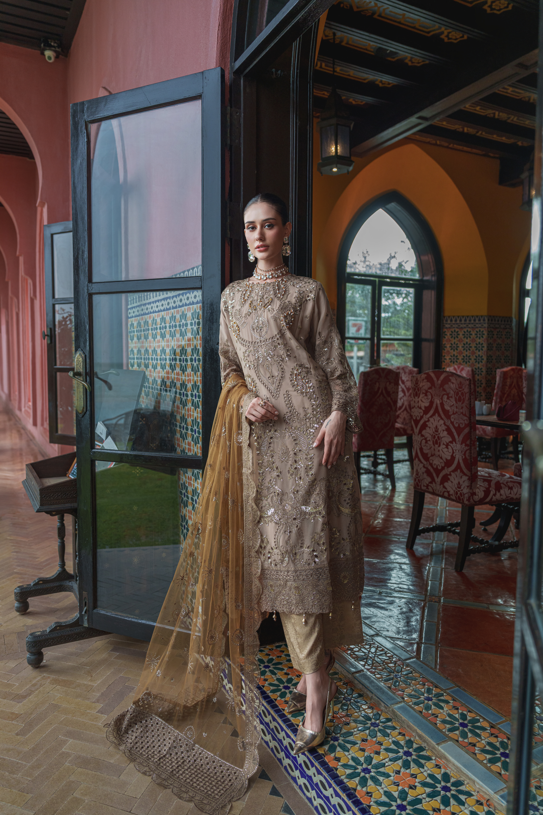 Experience refined elegance with the ZFEC-004 ensemble by Zainab Fazlani. This luxurious outfit features a heavily embroidered semi-stitched shirt adorned with intricate handmade adda work, delivering sophisticated craftsmanship. Complemented by an exclusive chiffon organza dupatta, richly embellished for a striking appearance. The raw silk jacquard trousers add texture and depth, creating a balanced and upscale silhouette perfect for special occasions.