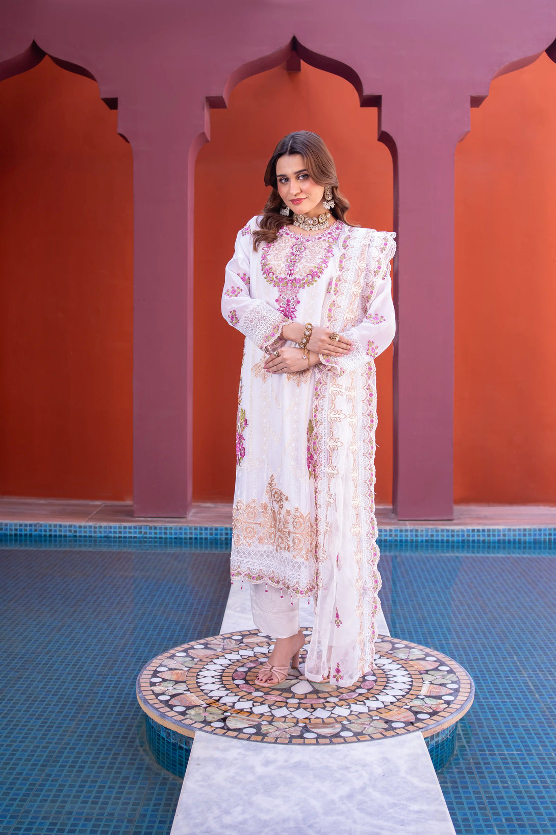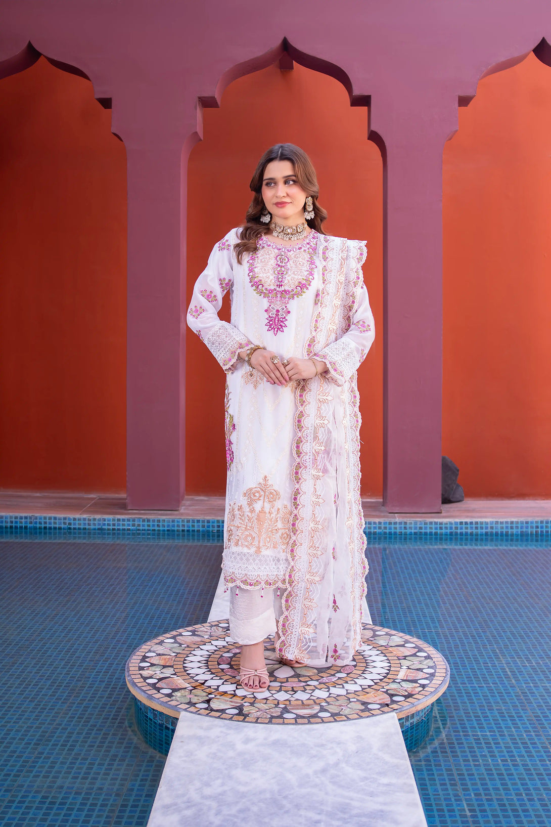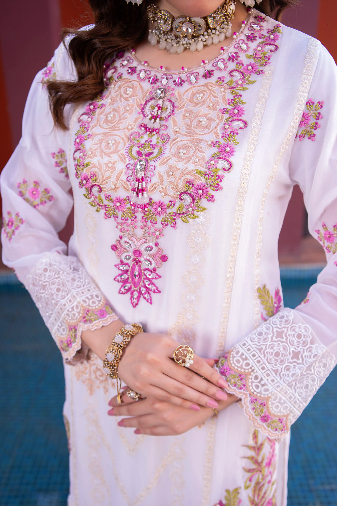 RIWAYAT Luxury Chiffon by Zainab Fazlani presents an exquisite three-piece ensemble crafted for the discerning woman. The semi-stitched shirt features intricate heavy embroidery adorned with meticulous hand-made adda work, showcasing traditional artistry. Paired with an exclusive embroidered chiffon organza dupatta, fully embellished with refined detailing, this collection exemplifies sophistication. The ensemble is completed with pure viscose jacquard trousers, offering comfort and elegance. Each piece reflects masterful craftsmanship and premium fabric selection, ideal for formal occasions and celebrations.