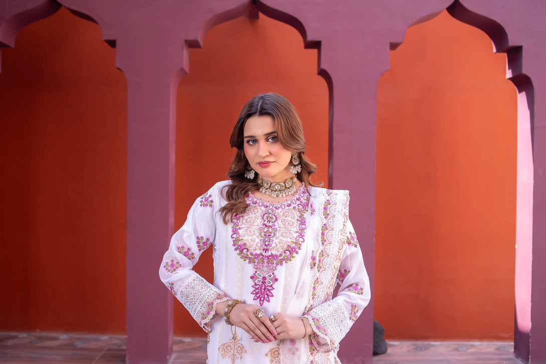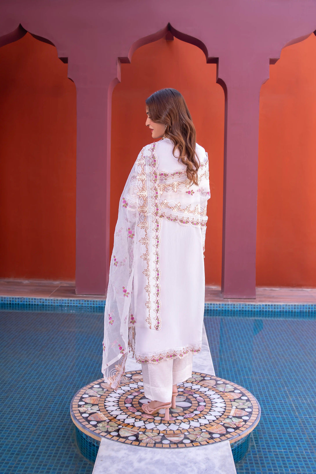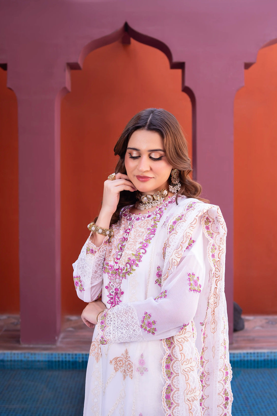 RIWAYAT Luxury Chiffon by Zainab Fazlani presents an exquisite three-piece ensemble crafted for the discerning woman. The semi-stitched shirt features intricate heavy embroidery adorned with meticulous hand-made adda work, showcasing traditional artistry. Paired with an exclusive embroidered chiffon organza dupatta, fully embellished with refined detailing, this collection exemplifies sophistication. The ensemble is completed with pure viscose jacquard trousers, offering comfort and elegance. Each piece reflects masterful craftsmanship and premium fabric selection, ideal for formal occasions and celebrations.